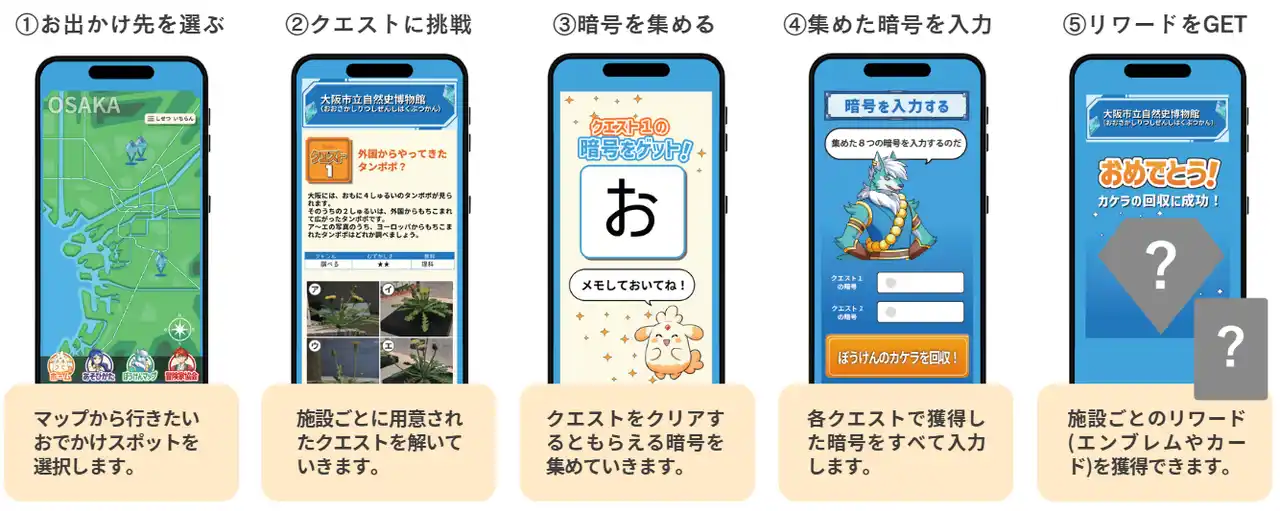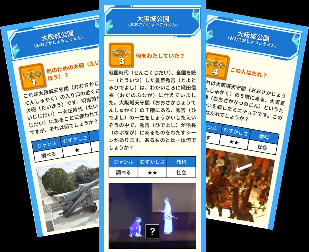 各文化施設とのコラボレーションによってクエストを作成。今回加わる「大阪城公園」では、大阪城天守閣や大阪城豊臣石垣館の展示物などを通して、豊臣家と関わりの深い歴史人物や当時のくらし、お城にまつわるクエストを展開します。 |