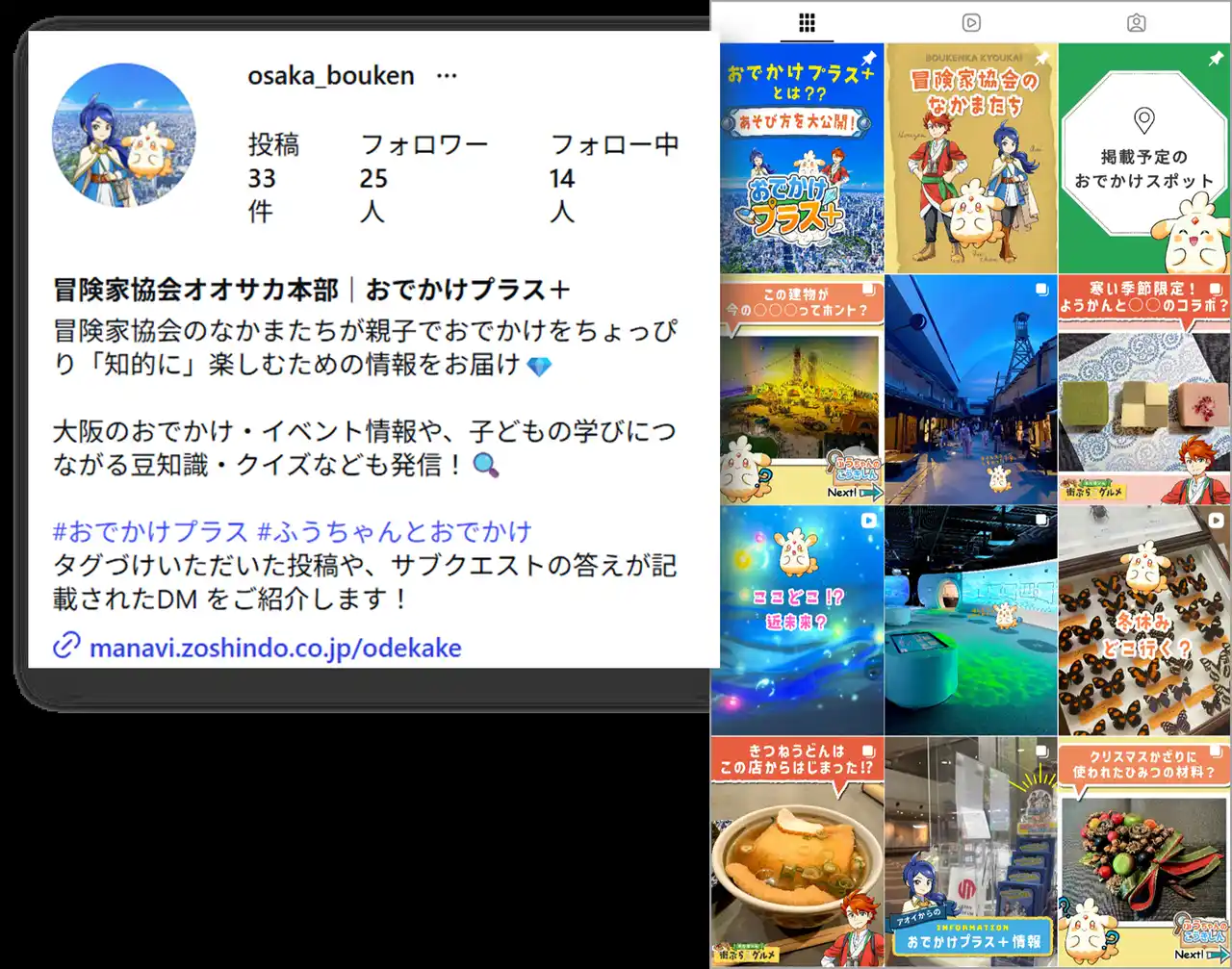 「おでかけプラス+」に登場する冒険家協会やキャラクターから、最新情報や親子でおでかけを楽しむコツ、大阪のおでかけスポット情報やグルメ情報などをお届けしています。 |