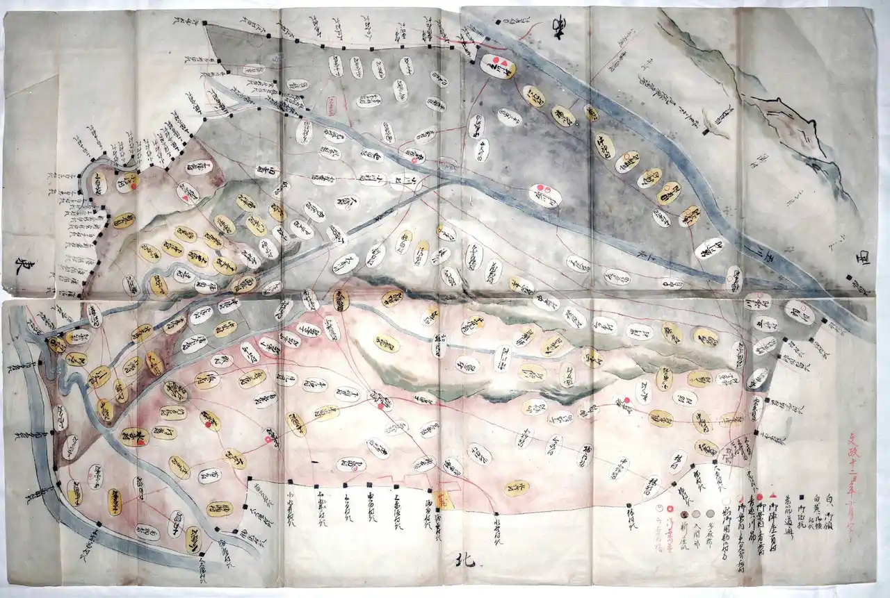 『新編立川市史 資料編 近世2』表紙:近世前期の砂川村の絵図(部分、砂川家所蔵) |