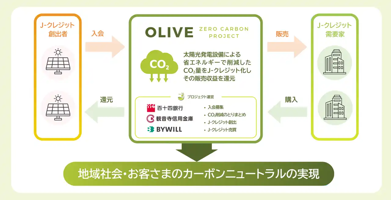 「GXをやりたくなる世界」を目指し、環境価値を活用した経済循環を推進する株式会社バイウィル(本社:東京都中央区、代表取締役社長:下村雄一郎、以下「バイウィル」)が、株式会社百十四銀行(本店:高松市、頭取:森匡史、以下「百十四銀行」)および観音寺信用金庫(本店:観音寺市、理事長:小林浩二)と連携して推進する「オリーブ・ゼロカーボンプロジェクト」について、J-クレジット制度の第68回認証委員会にて正式にプロジェクト登録が完了したことをお知らせします。 |