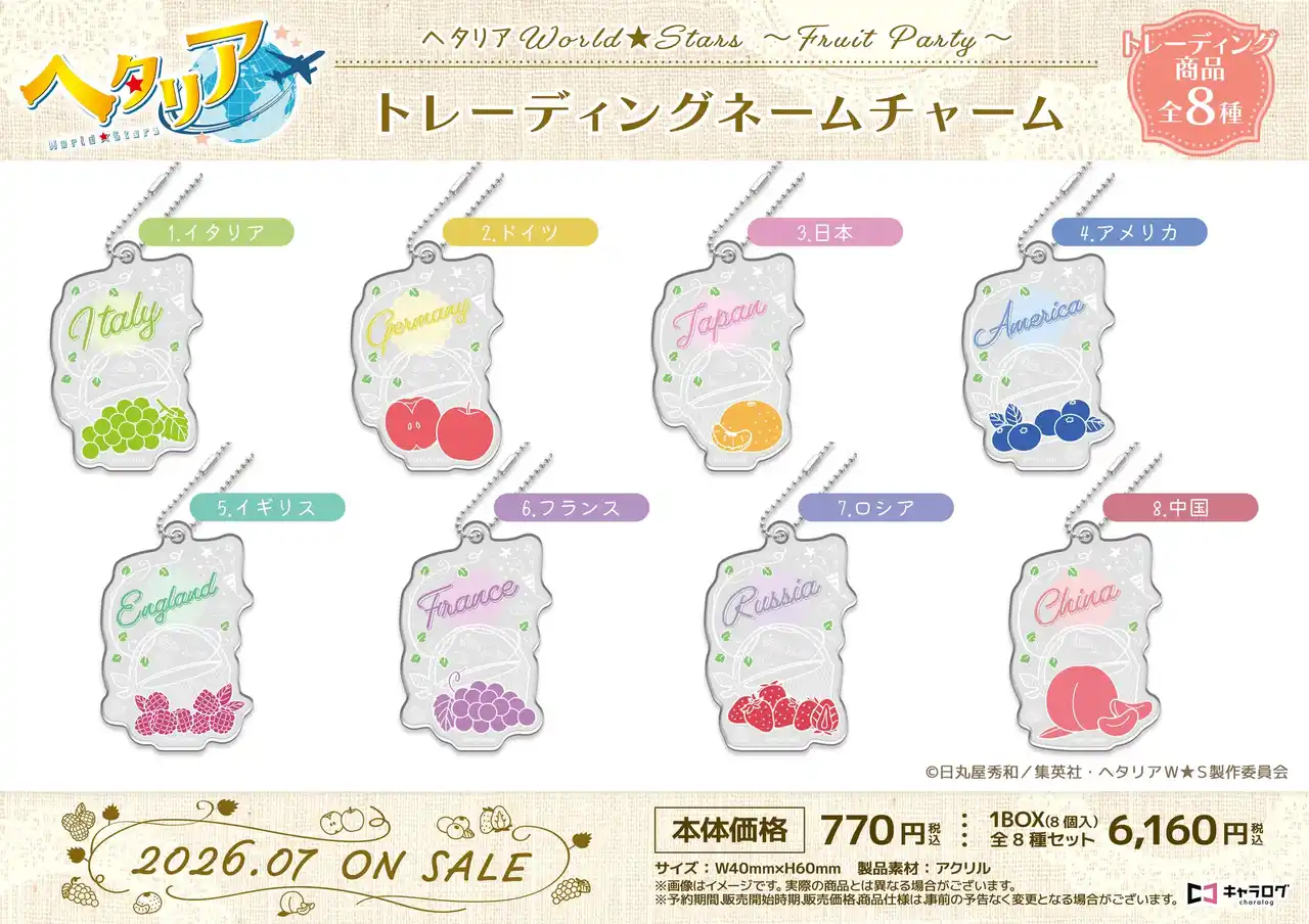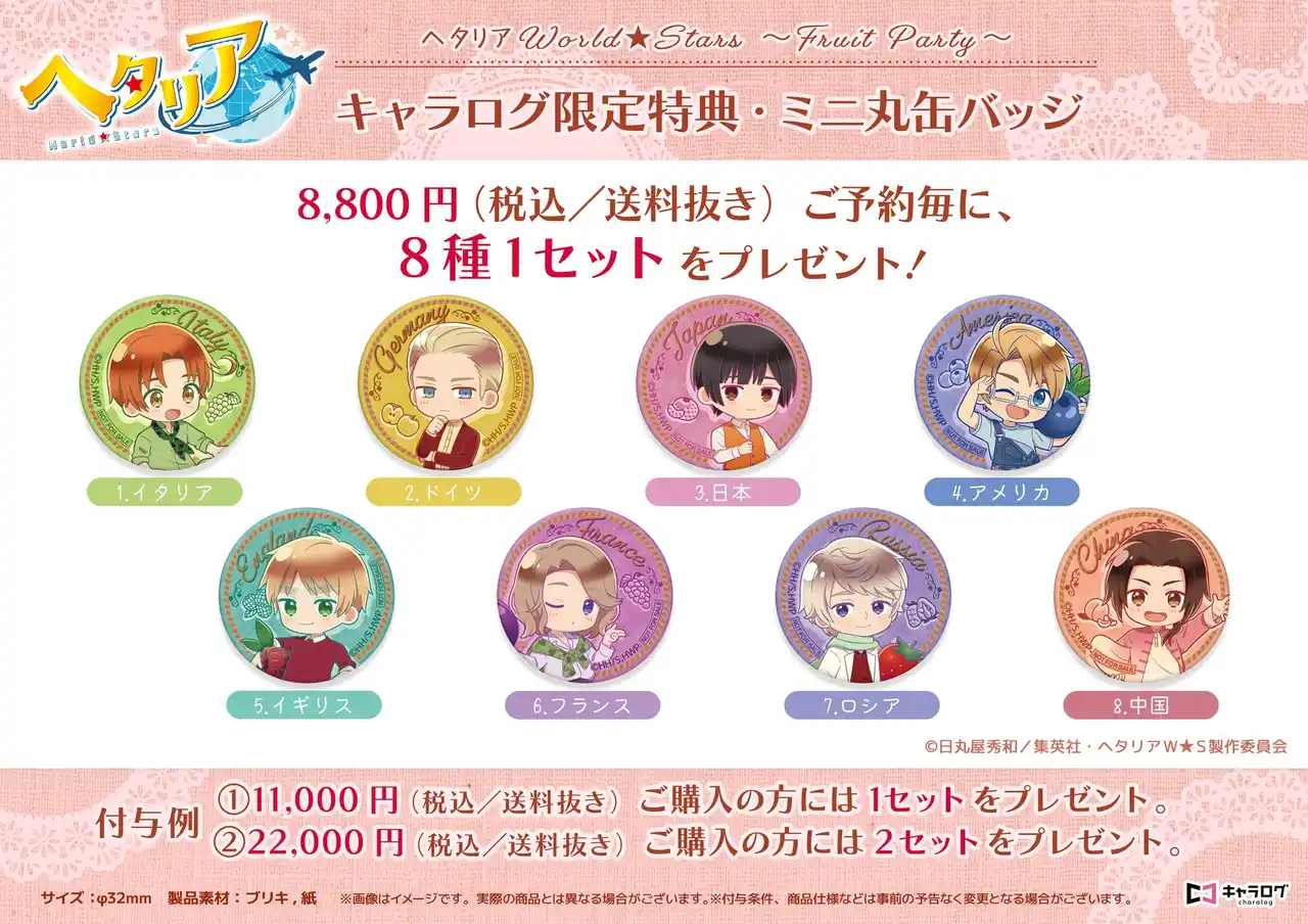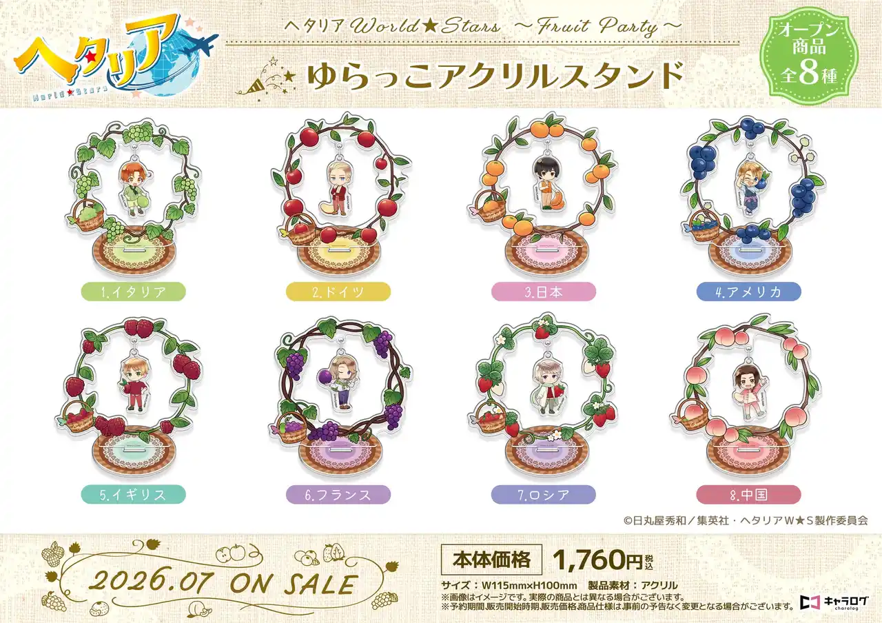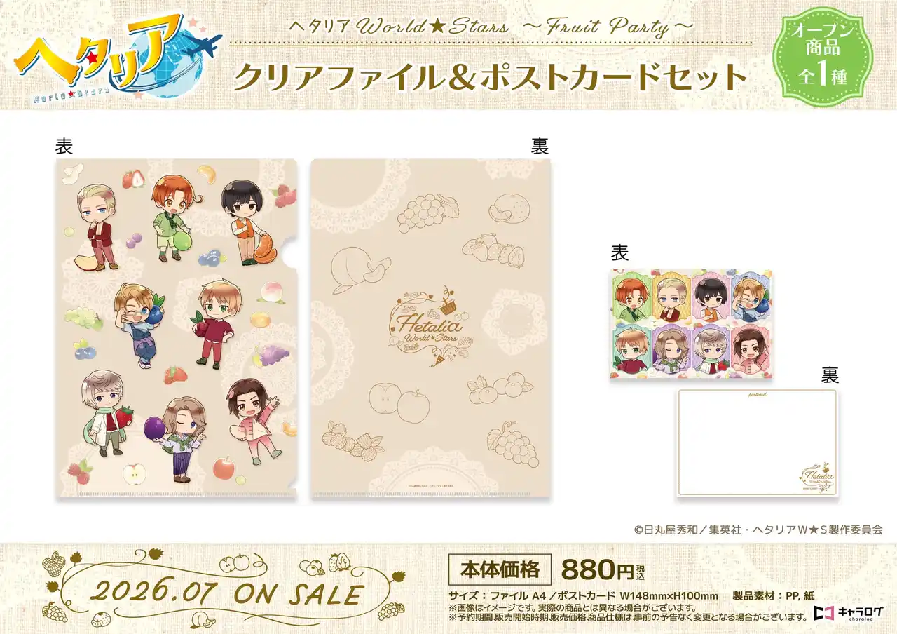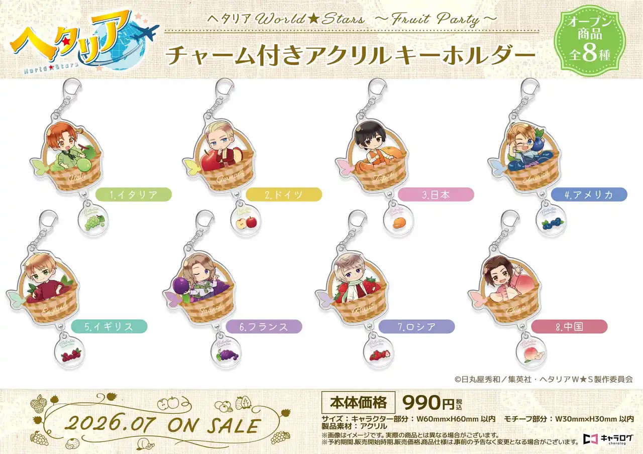 キャラログ他、全国のアニメショップやECサイトにて予約受付中! キャラログ初のオリジナル衣装「ヘタリア World★Stars ~Fruit Party~」をどうぞお見逃しなく! |