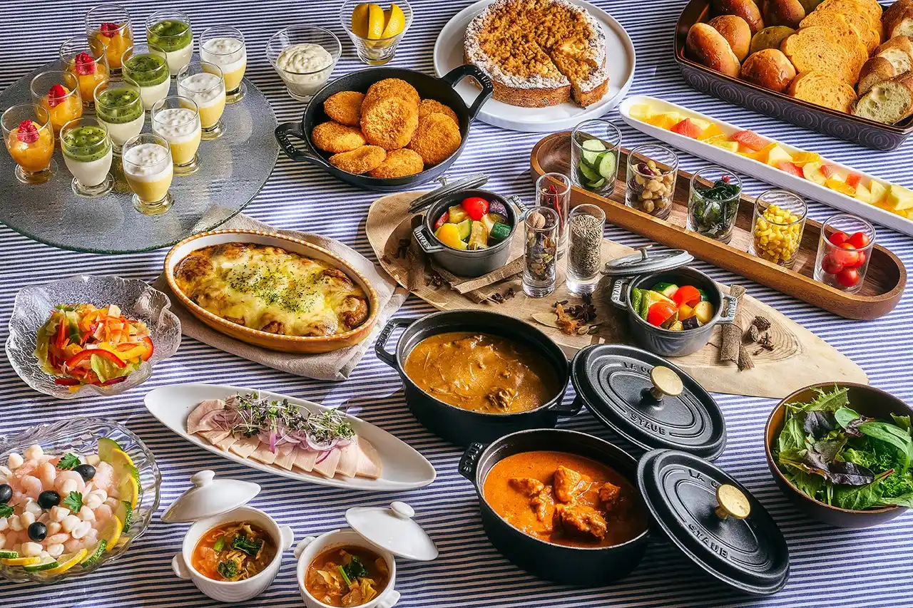「シーフードのシトラスマリネ」などの冷製料理をはじめ、「カレーセレクション」や「照り焼きミートグラタン」などの温製料理、さらに「アップルシナモンケーキ」などのデザートまで、約15種をラインアップ。多彩な味わいをお楽しみいただけます。 |