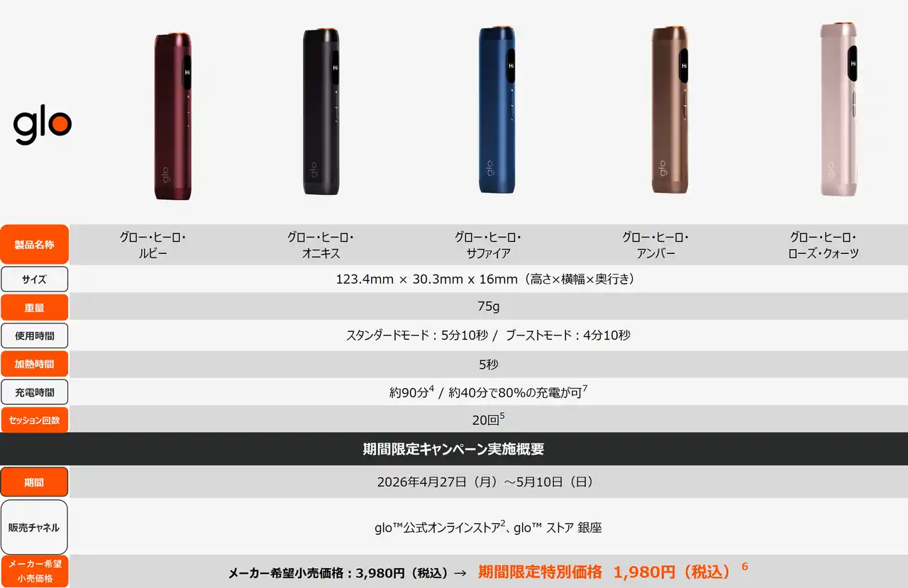 また、「glo(TM) Hilo(グロー・ヒーロ)」および「glo(TM) Hilo Plus(グロー・ヒーロ・プラス)」も2026年4月27日(月)から5月10日(日)までの期間、glo(TM)公式オンラインストアおよび各公式オンラインストア[2]、ならびにglo(TM) ストア 銀座にてデバイスの全カラーを対象にメーカー希望小売価格から2,000円オフで販売いたします。 |