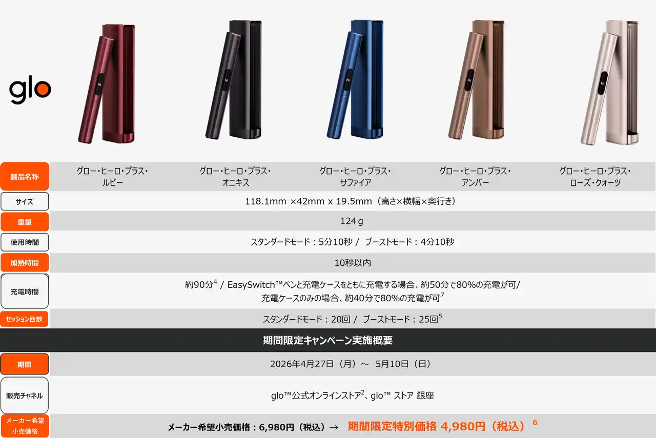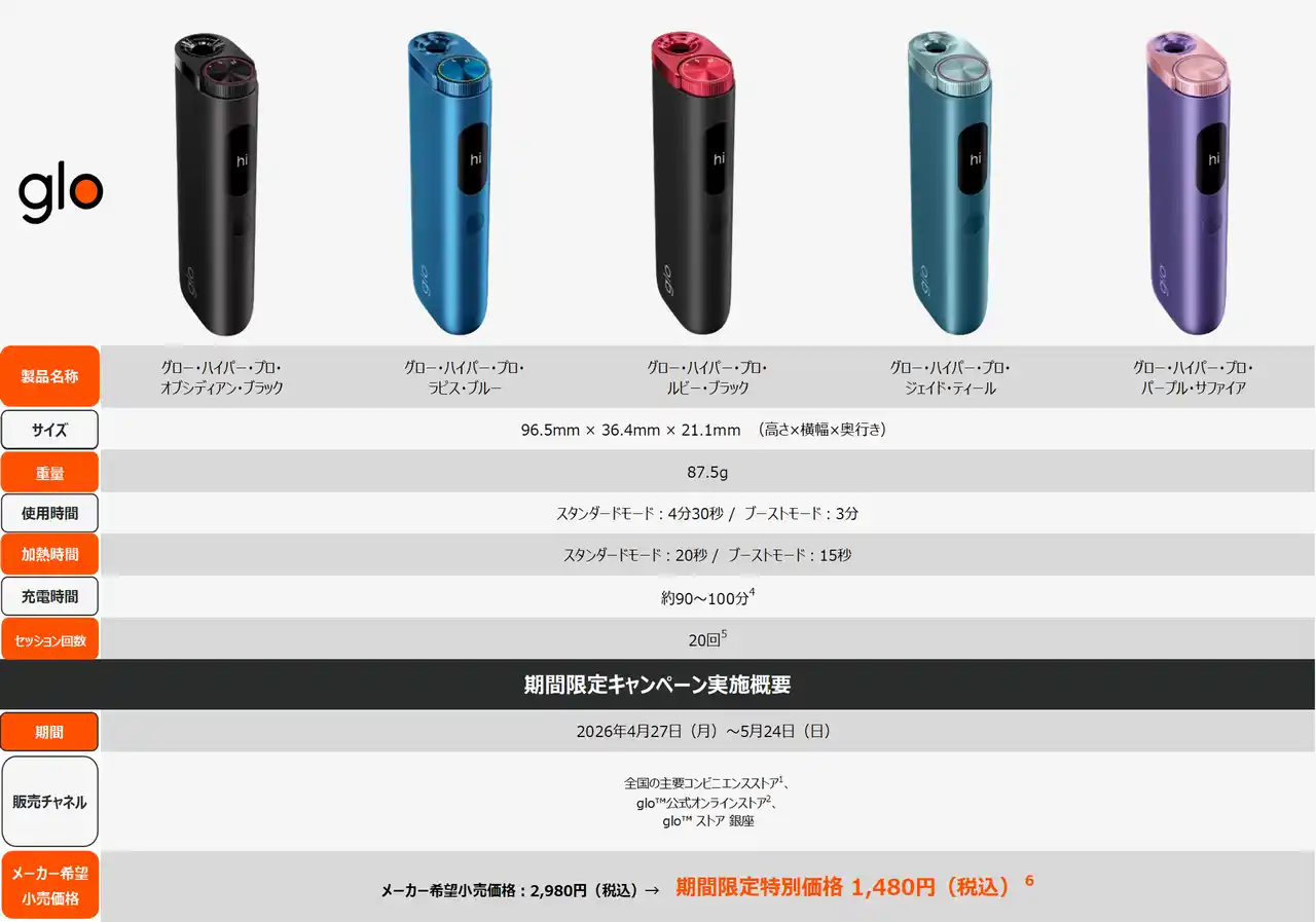 ブリティッシュ・アメリカン・タバコ・ジャパン合同会社(本社:東京都港区、代表:マウリシオ・ララ、以下「BATジャパン」)は、2026年4月27日(月)から5月24日(日)までの期間、加熱式たばこデバイス「glo(TM) Hyper Pro(グロー・ハイパー・プロ)」の全5カラーを対象に、期間限定の特別価格1,480円(税込)で販売するキャンペーンを実施します。 |