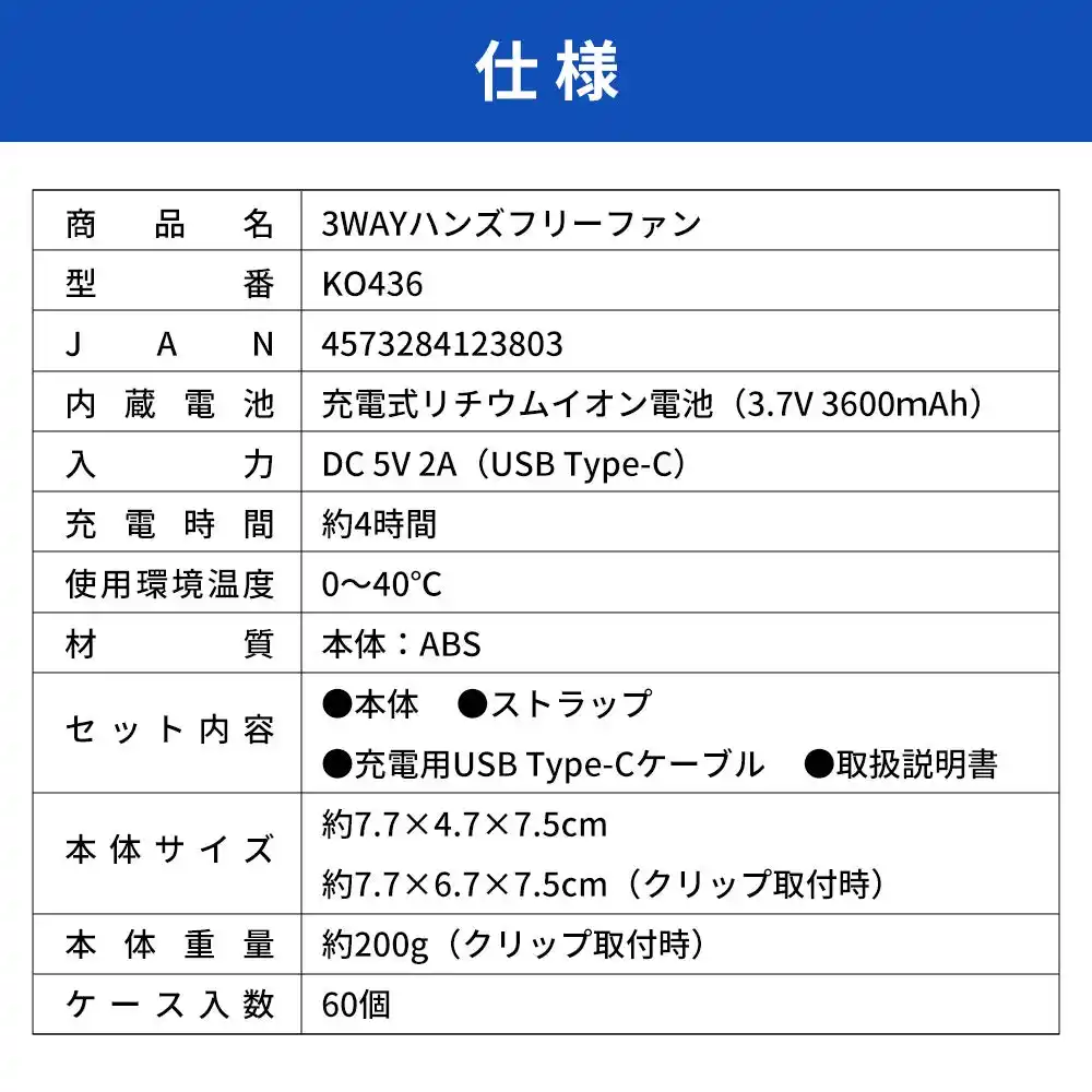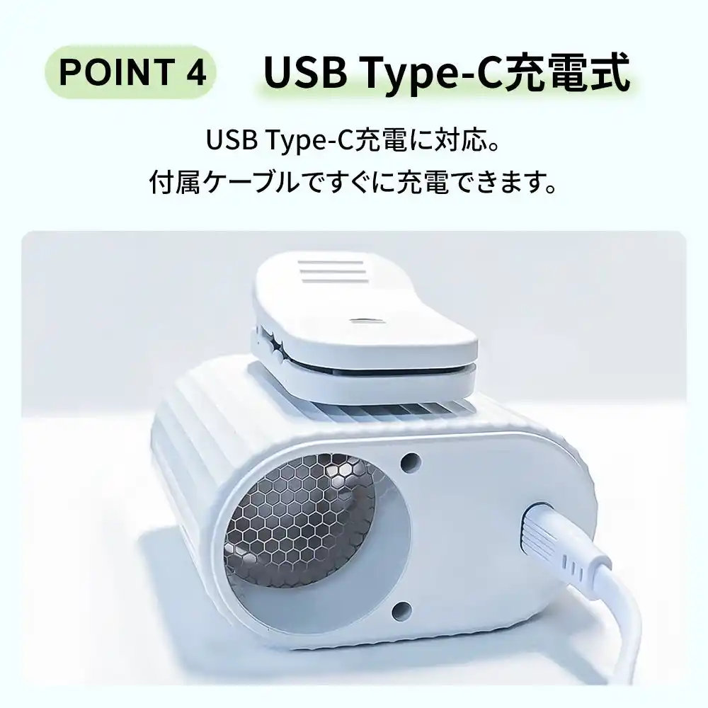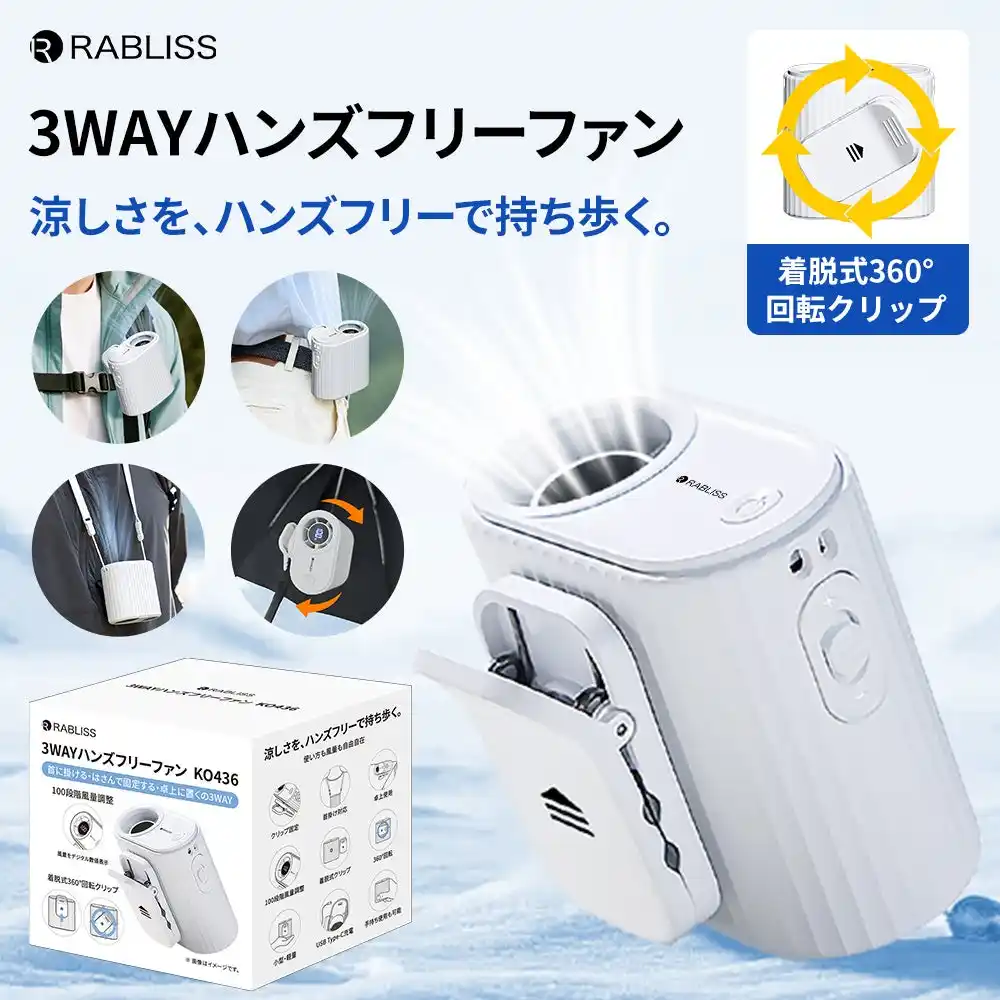 | 首掛け・クリップ固定・卓上の3WAYファン。着脱式360°回転クリップと100段階風量調整で、使い方も風量も自由自在。USB充電式で、いつでもどこでも手軽に暑熱対策ができるアイテムです。 |
