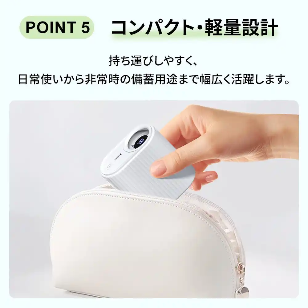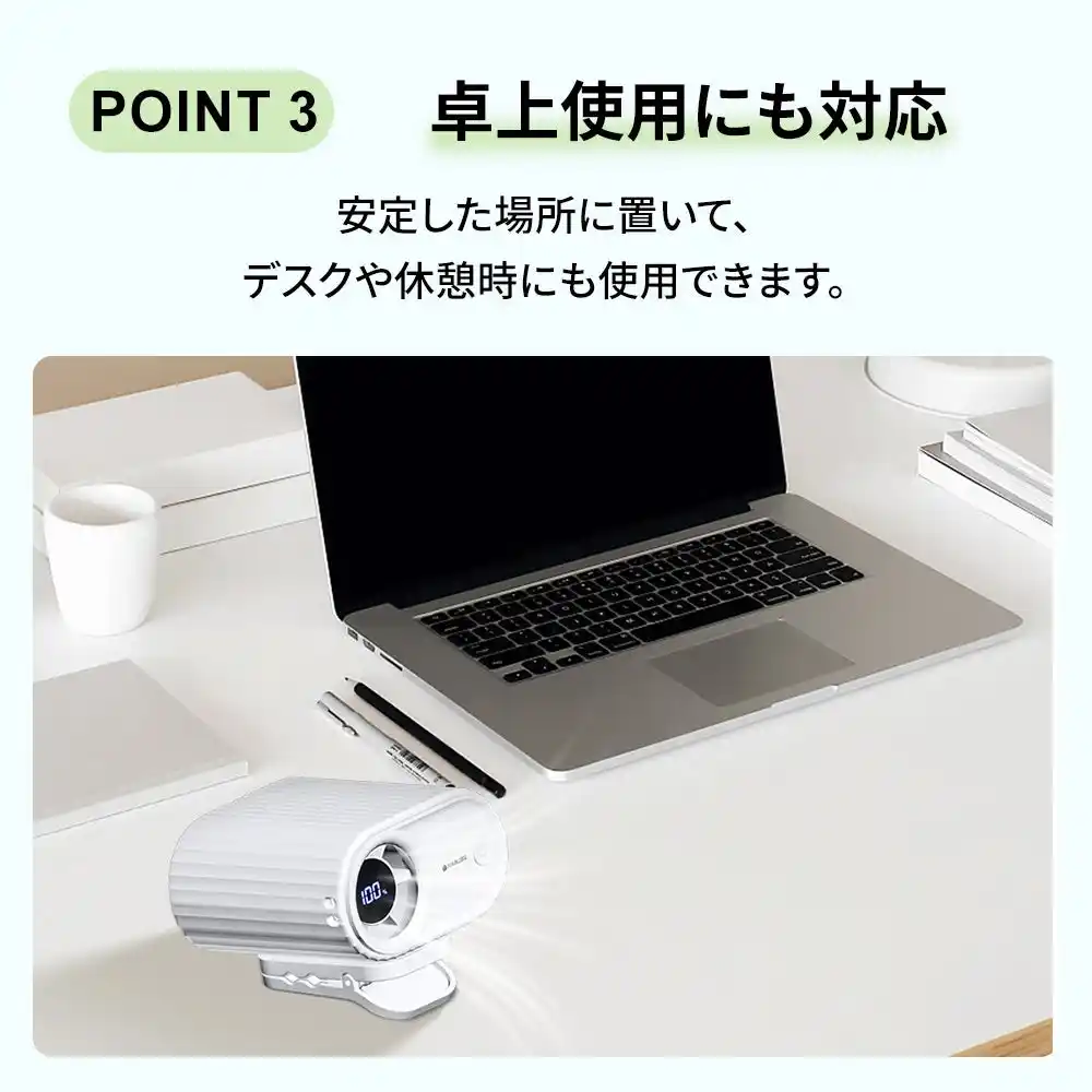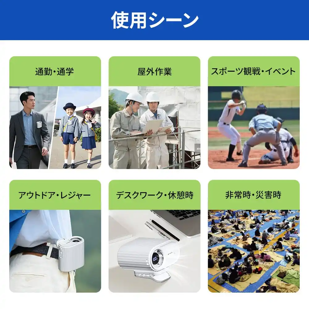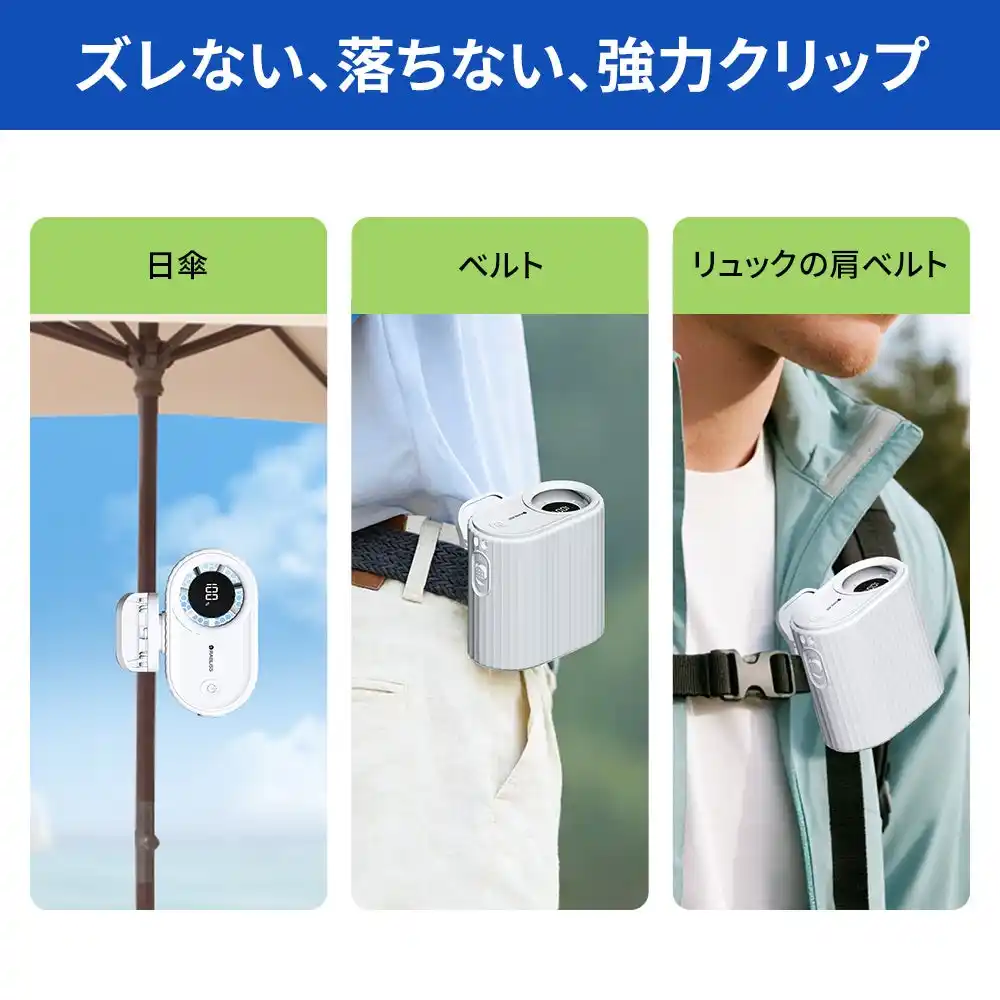 | 取り外し可能な大型クリップ設計により、バッグ、日傘、ベルトなど、様々なスタイルで取り付けができ、さらに付属のストラップで首掛けにも対応しているため、いつでもどこでも、手をふさいでしまうことなく暑熱対策ができる小型ファンです。もちろん、卓上に置いて使うこともできるので、職場の机や、作業台の上など、屋内作業中でも手軽に熱中症対策ができるアイテムです。 | |||