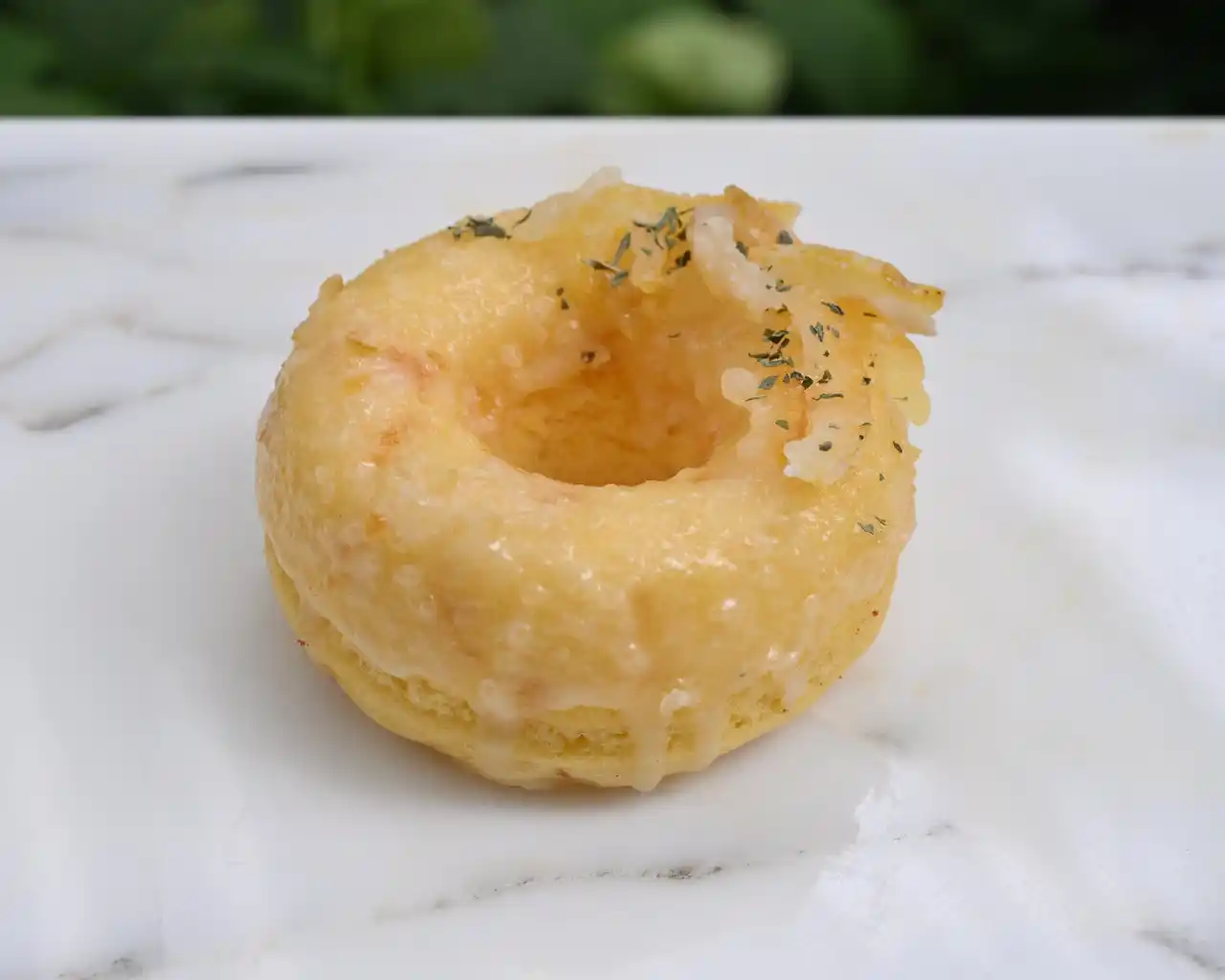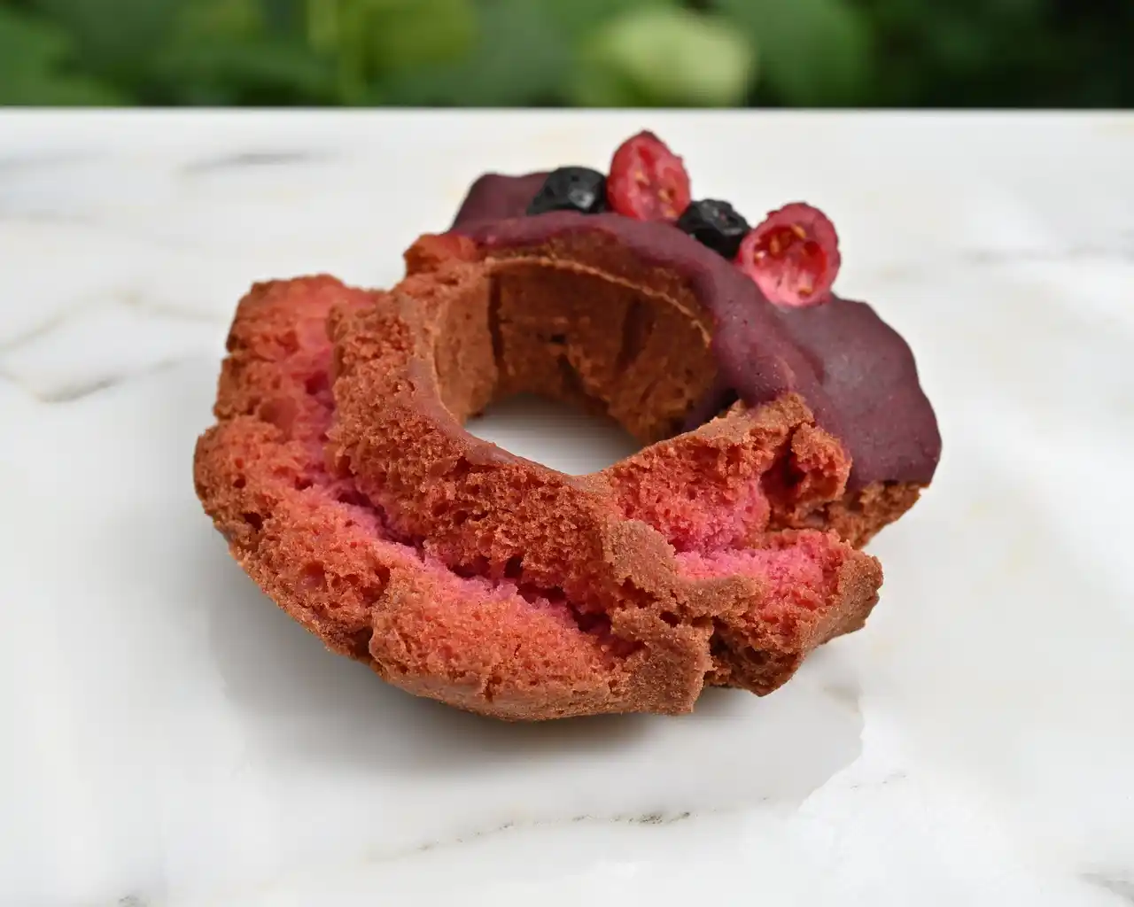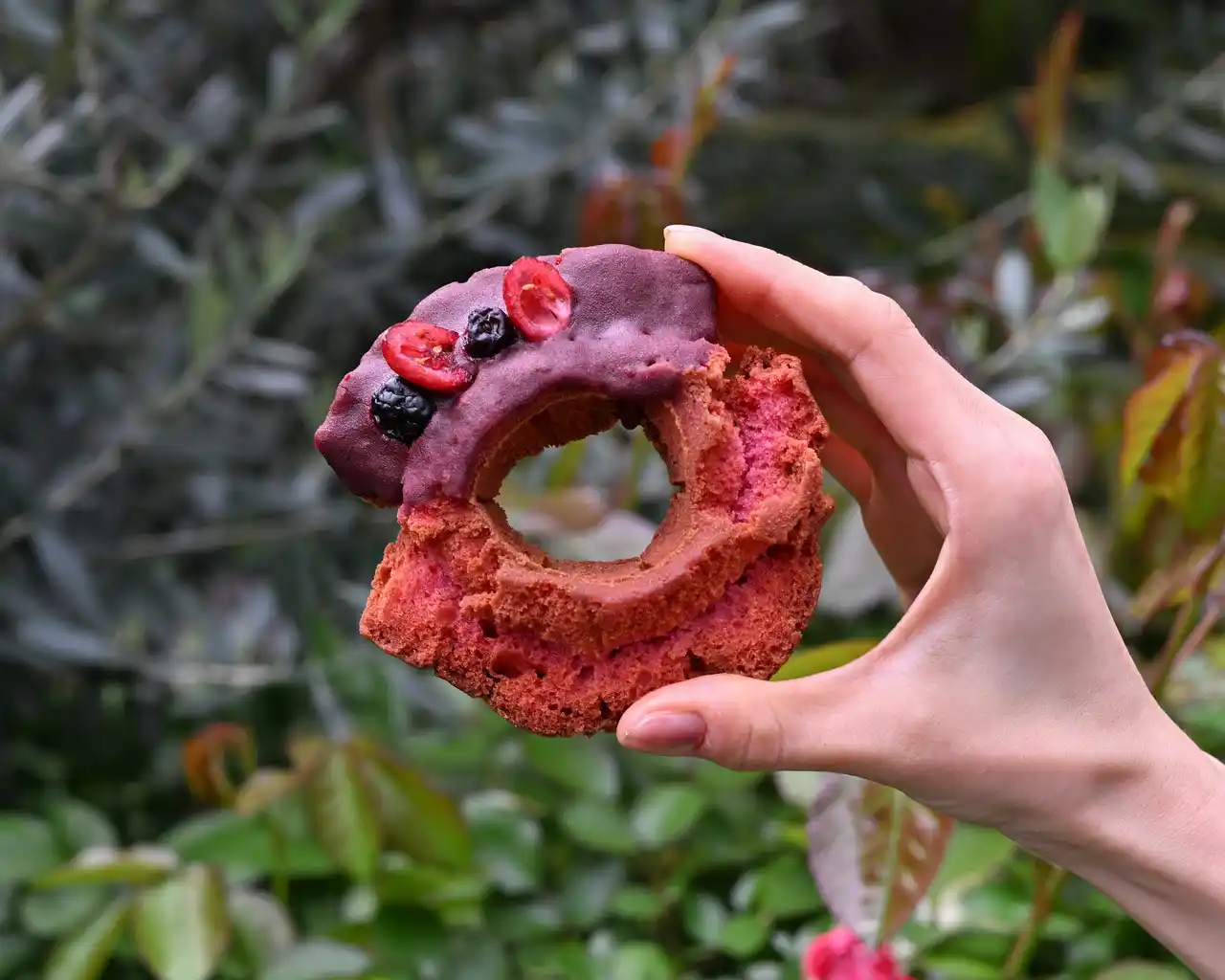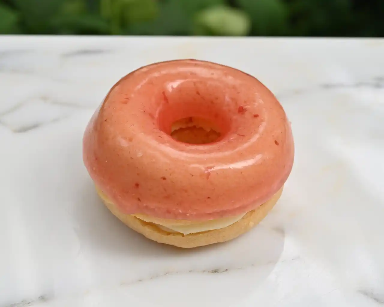 ローズオイルを練り込んだ生地にクリームチーズをサンドし、ローズゼリーをトッピング。華やかな香りが立ち上がる、紀尾井町ローズ祭りに合わせた限定ドーナツです。 |