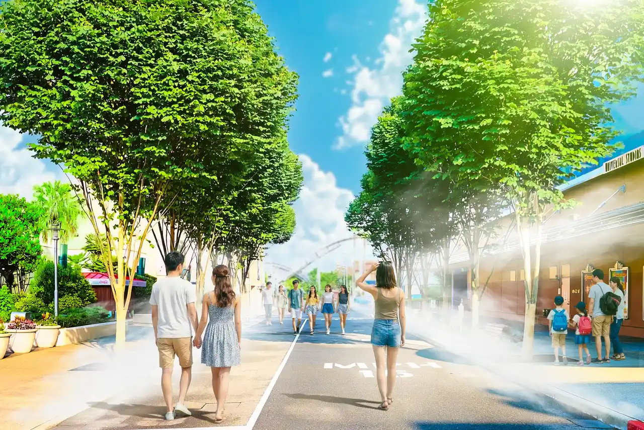 昨年ハリウッド・エリアに誕生した、青々と茂ったケヤキの木陰で休息できる並木道『グリーン・ストリート』に、足元から吹き上がるミストを追加することで、より一層の体温低下を狙う『クール・グリーン・ストリート』が登場します。同じくハリウッド・エリアに、ケヤキの木陰で涼むことができる憩いの場も新しく設置します。 |