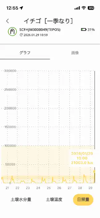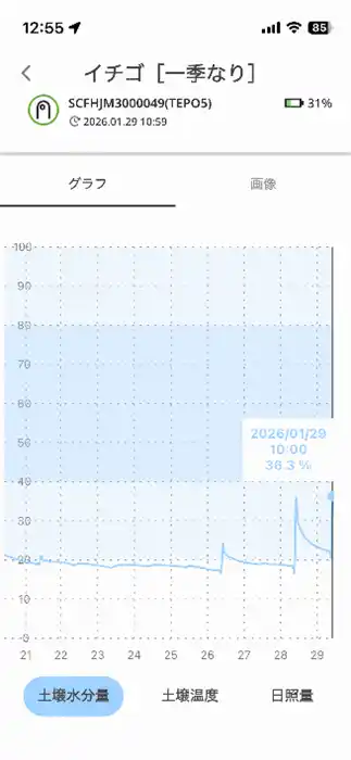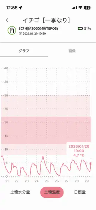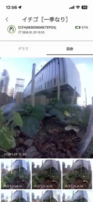 さらに、grow CONNECT にはカメラが搭載されているので、栽培している野菜や田んぼの様子が画像で見れるだけではなく、「土壌温度」「土壌水分量」「外気温」「日照量」などのグラフが表示され、日々の栽培の目安にもなります。 |