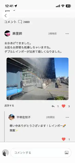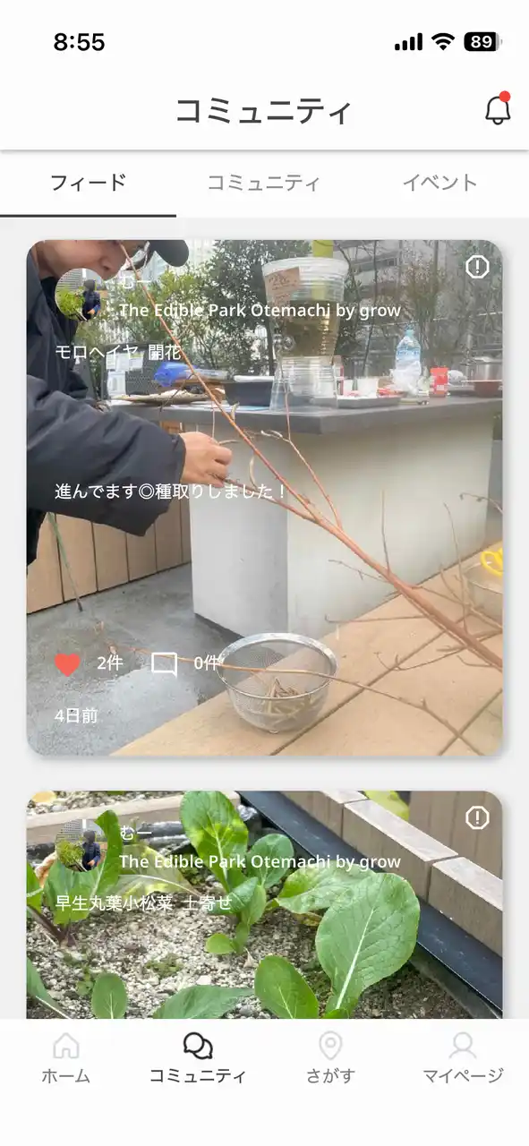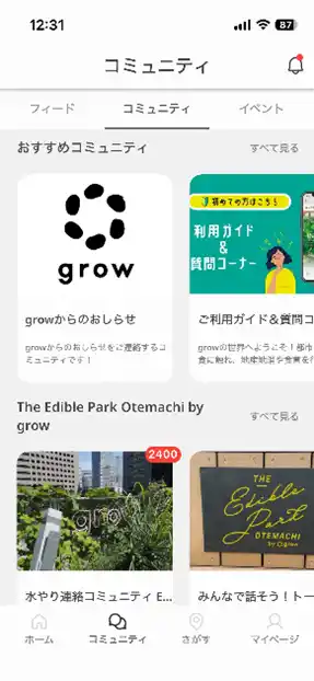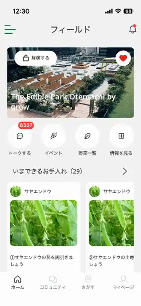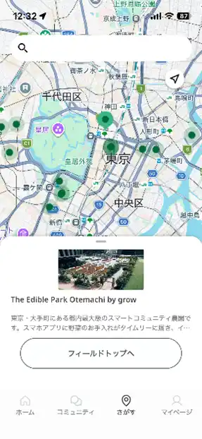 grow アプリは共同・コミュニティ型栽培に特化したアプリで、MAP から近くの農園をすぐに探して、フォローしたり、メンバーになることが出来たり、参加してる農園のメンバー同⼠でのコミュニケーションや、イベントへの参加、さらにはお手入れをすることでポイントが貯まったりと、コミュニティ農園での日々のやりとりをたのしくしてくれます。 |