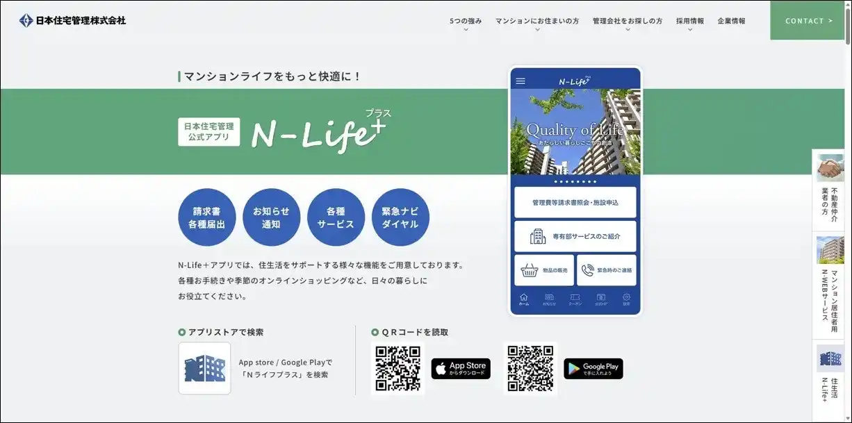 同ページでは、日本管財住宅管理および日本住宅管理が提供する、居住者向けマイページサービス「N-WEB」や、暮らしをサポートするサービス「N-Life+」をはじめとする各種サービスへの動線を整備し、日常的なお手続きやお問い合わせをより分かりやすくご案内できる構成としています。 |