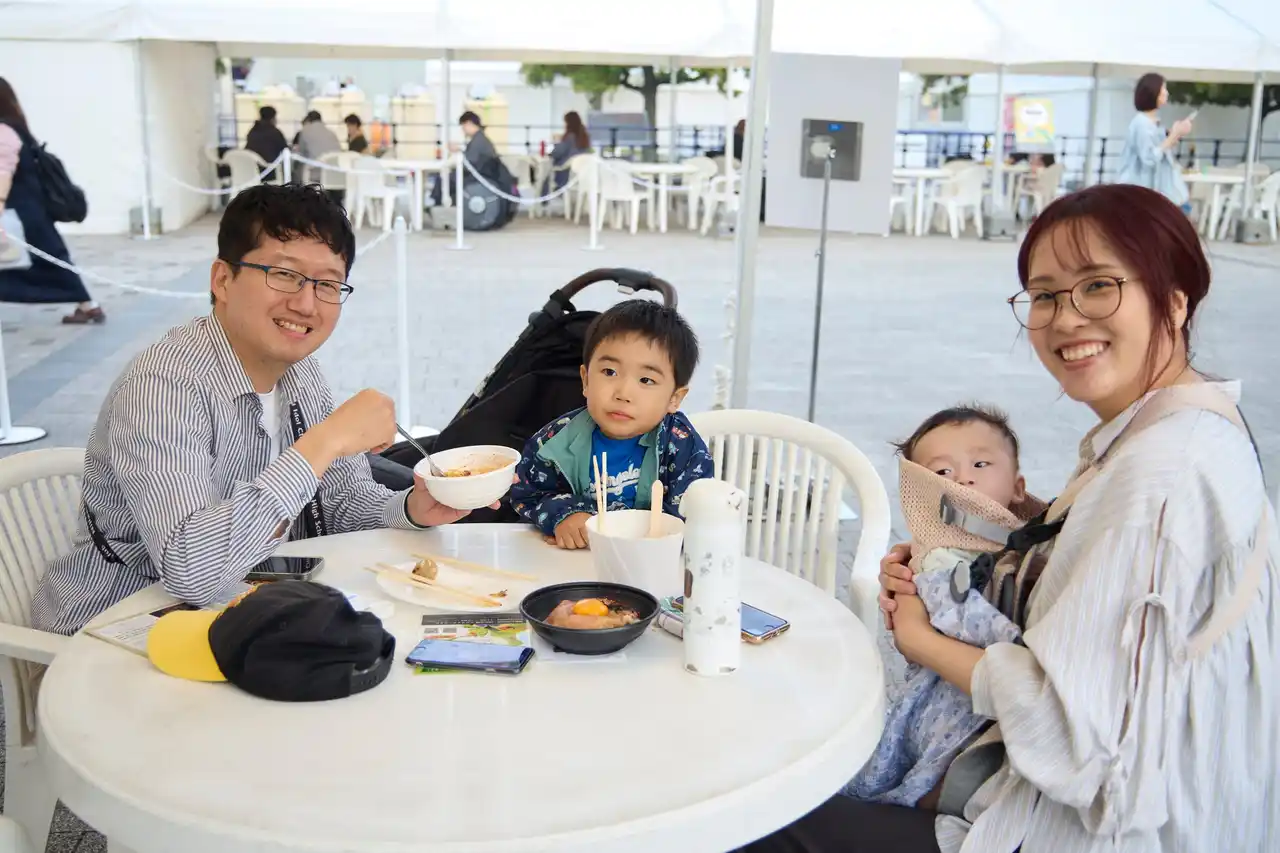 会場内には1,500席以上の座席をご用意し、そのうち8割以上に屋根を設置。天候を気にせずゆったりとお食事をお楽しみいただけます。さらに、お食事の際にベビーカーを横付けできる「ファミリー優先シート」や授乳室、ベビーカー置き場、おむつ替えコーナーも完備しており、小さなお子様連れの方も安心してご来場いただけます。また、お子様も食べやすい味付けやサイズのキッズメニューや、親子で参加できるワークショップなどの体験コンテンツも充実しており、ご家族で一日を通してお楽しみいただけます。 |