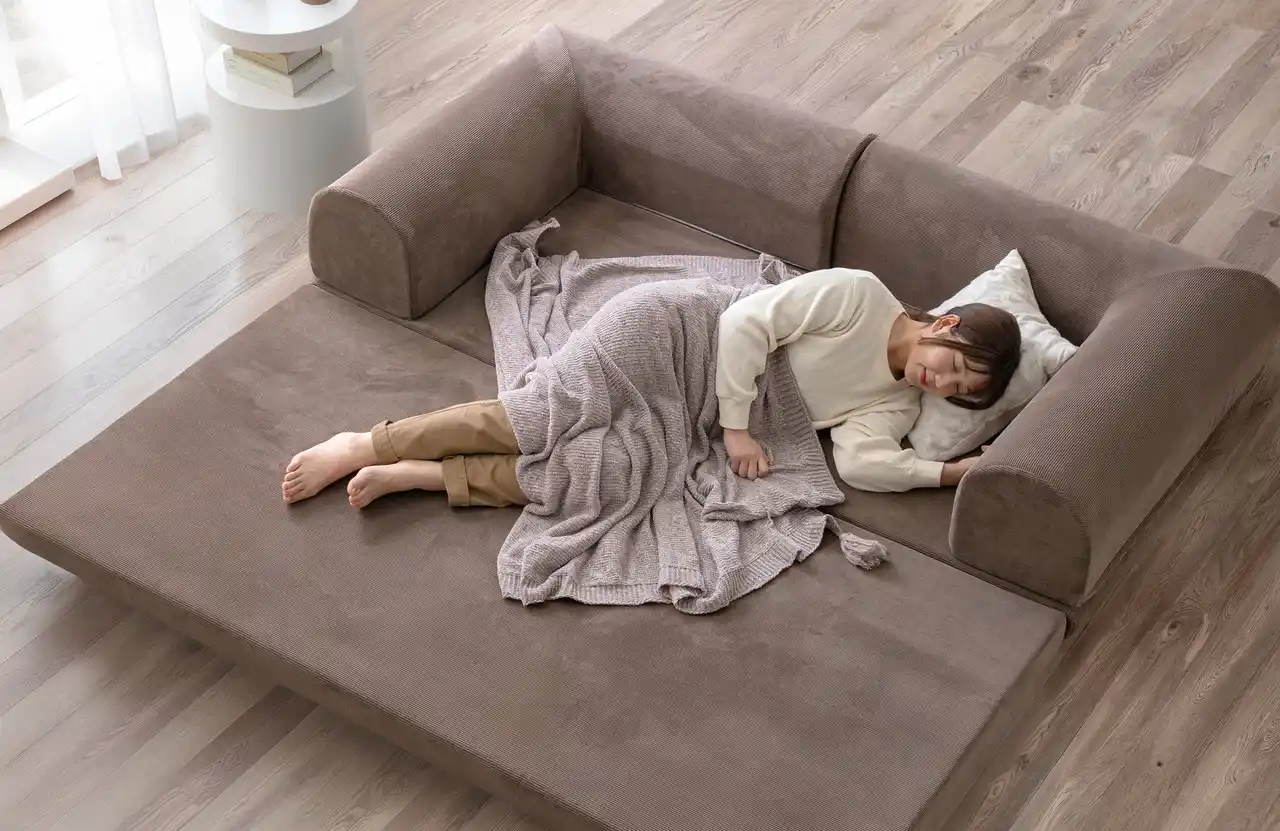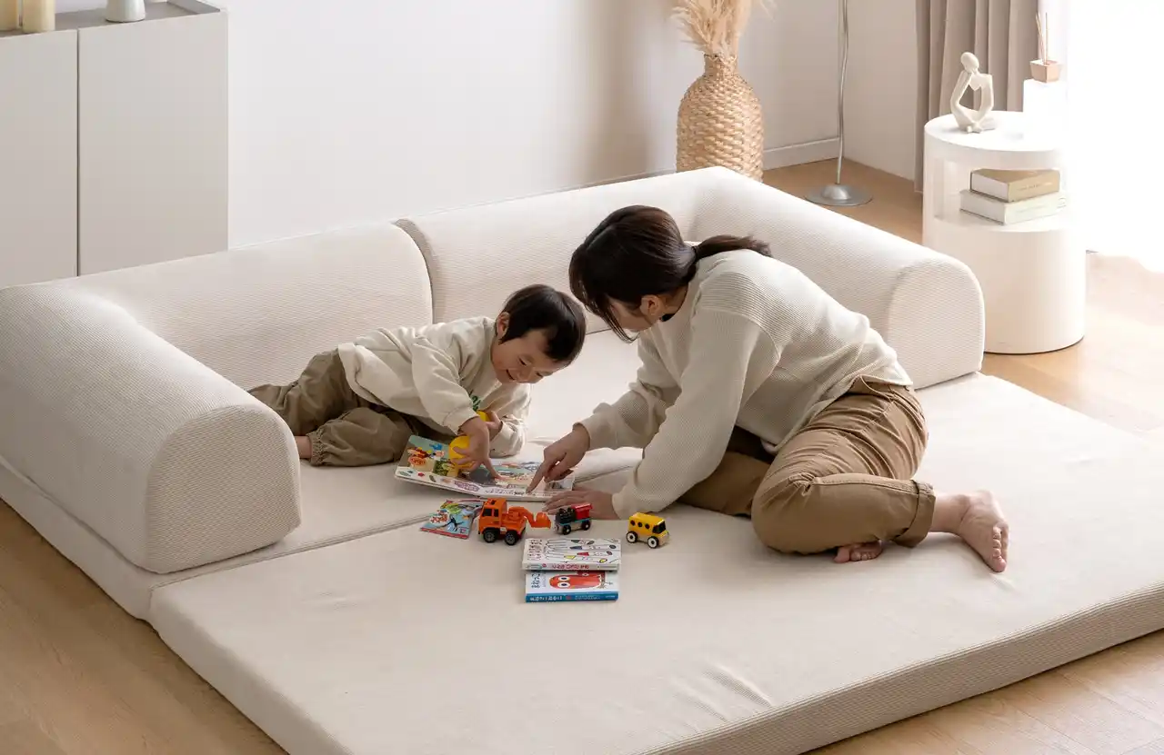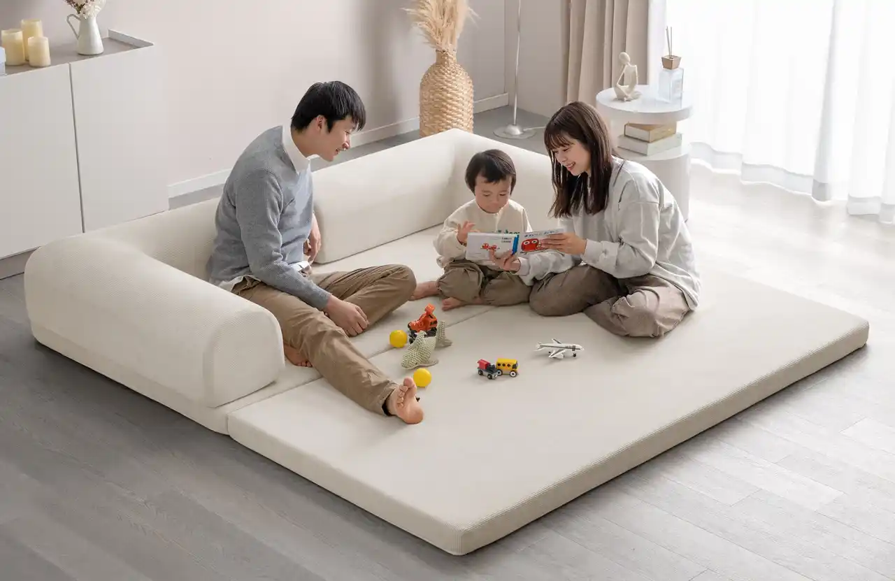 | 【タンスのゲン】たたんで広げて組み替えて、これ一台で座る・遊ぶ・寝るが丸ごと実現!折りたたみ可能な座面と好きな場所に配置できるL字クッションで、自由にアレンジ |