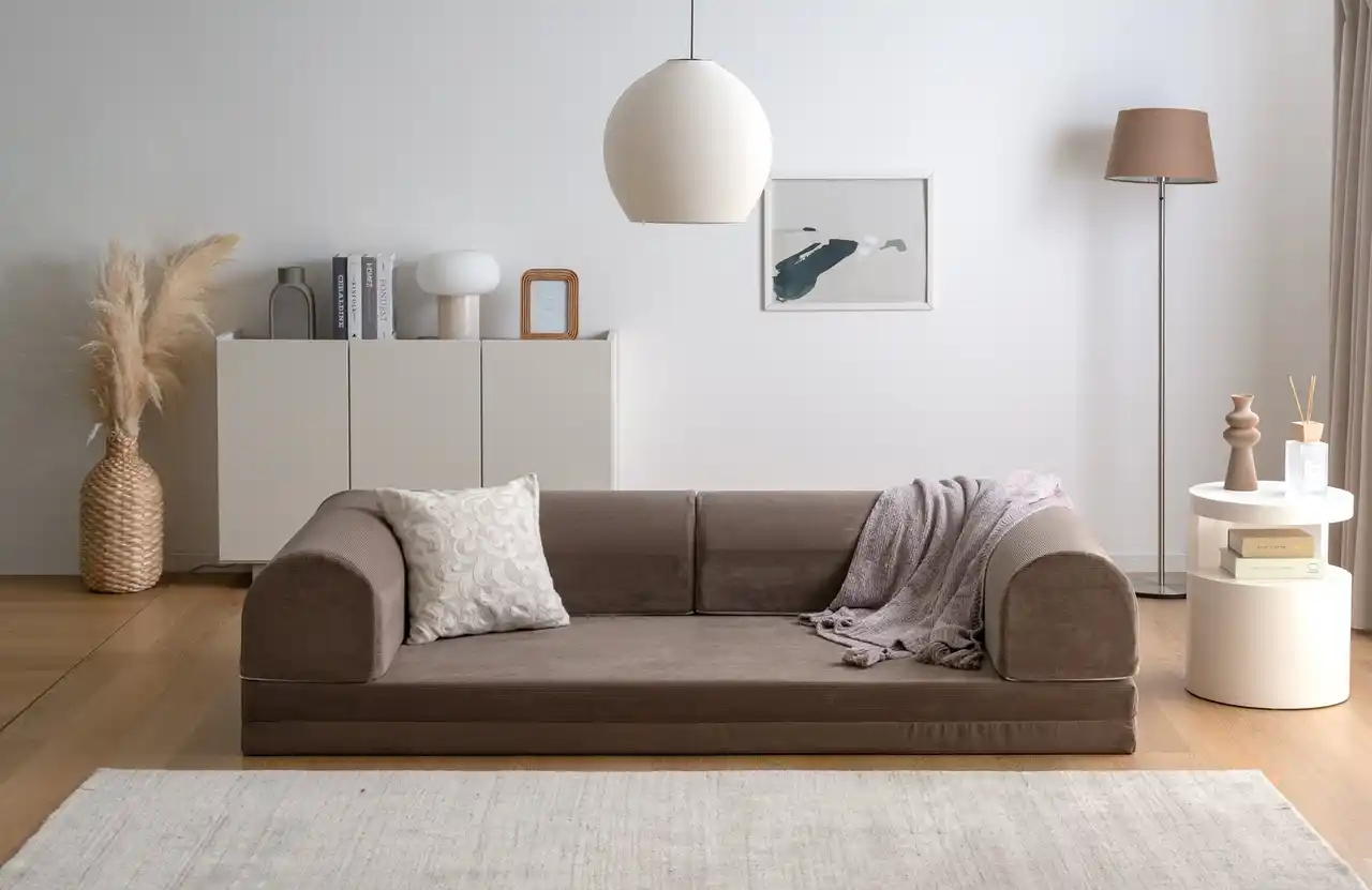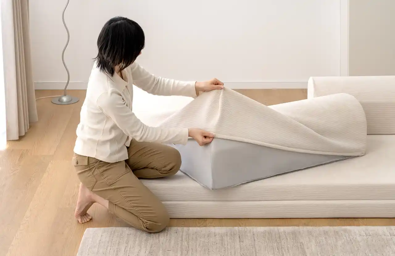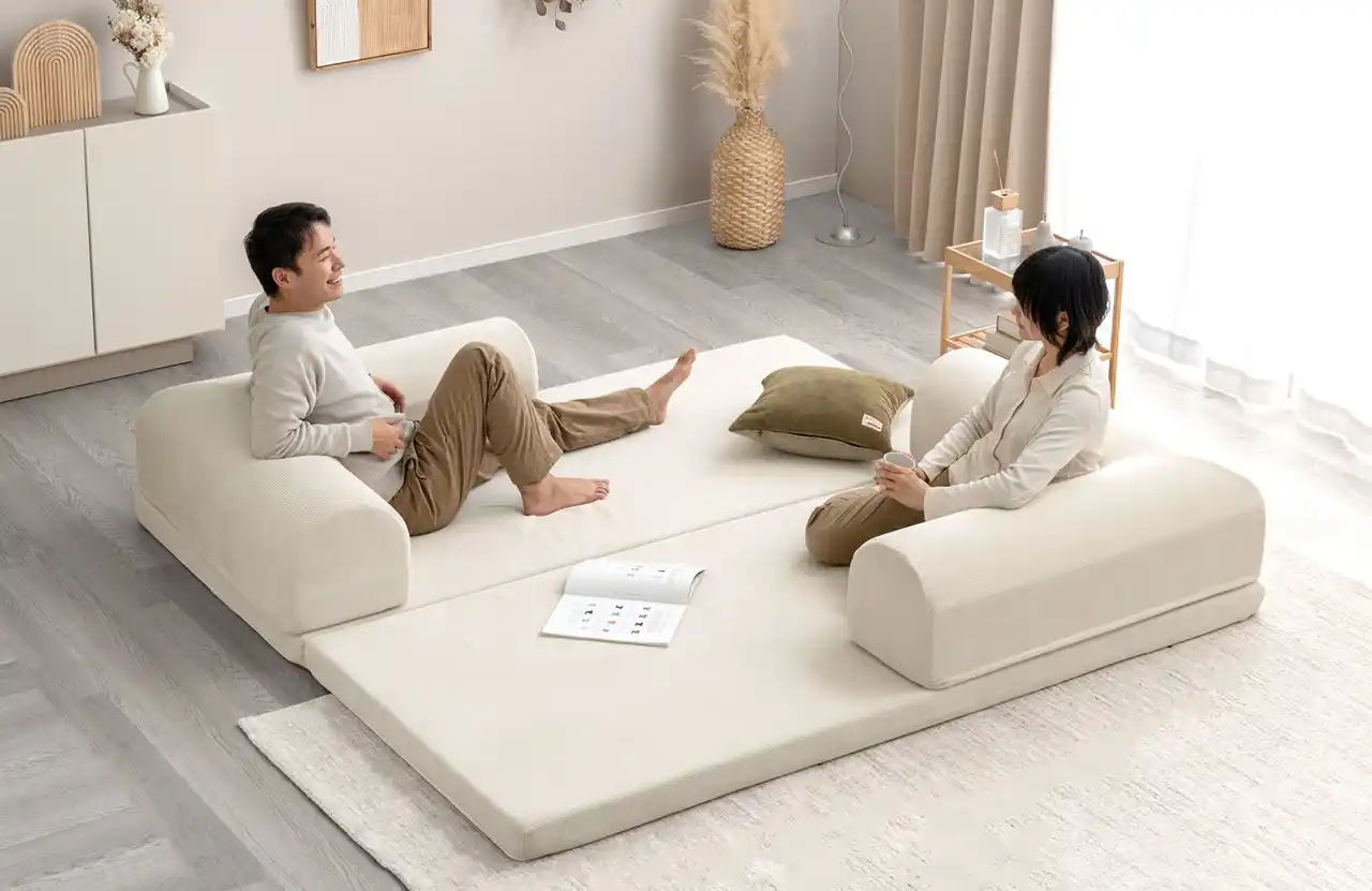 | 【タンスのゲン】たたんで広げて組み替えて、これ一台で座る・遊ぶ・寝るが丸ごと実現!折りたたみ可能な座面と好きな場所に配置できるL字クッションで、自由にアレンジ |