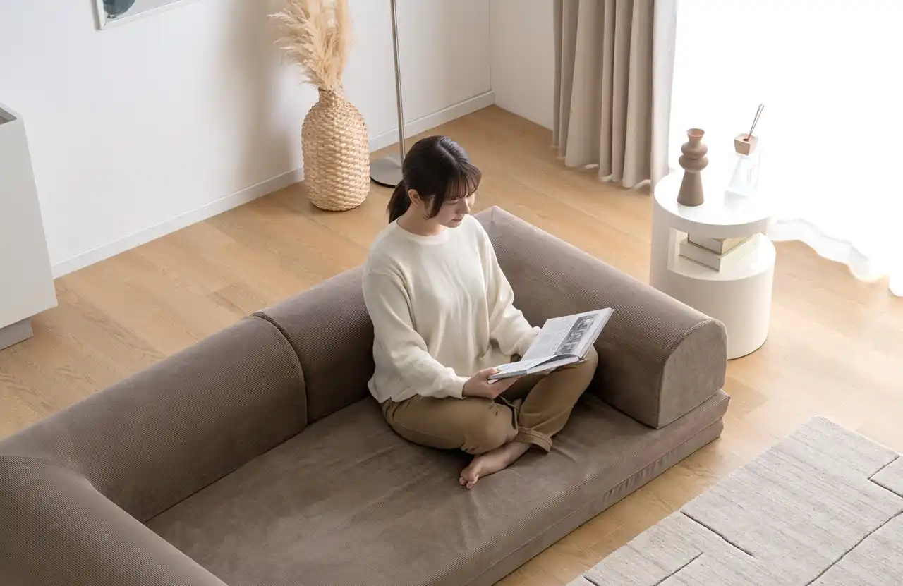 | 「ローソファ」のような座面をたたんだ状態では、圧迫感を抑えることができるため、お部屋をすっきり見せつつも、あぐらもかける広々とした座面になっているので、ゆったりとしたくつろぎを実現します。テレビを見たり、本を読んだりなど、一人でのリラックスタイムにぴったりです。 | |||||||||||