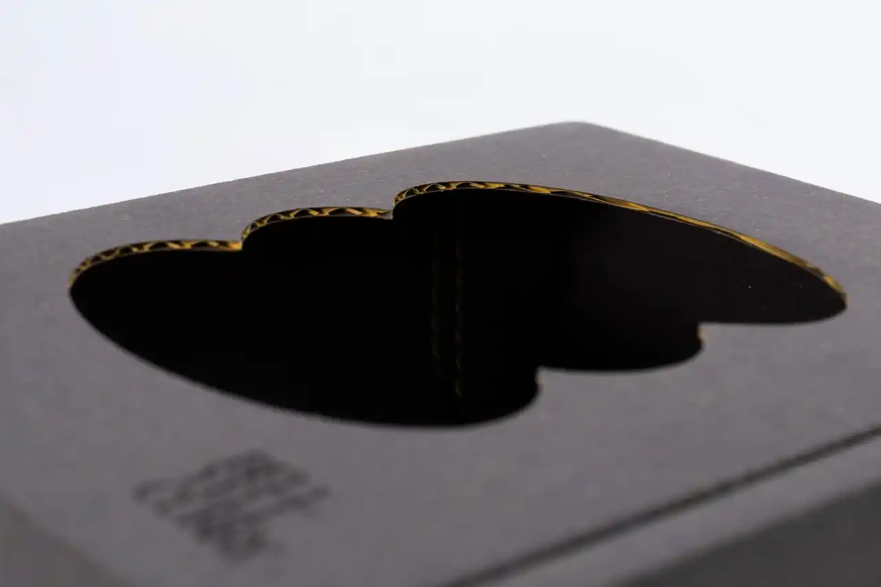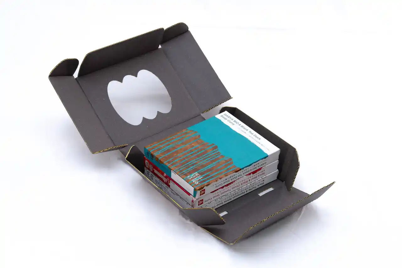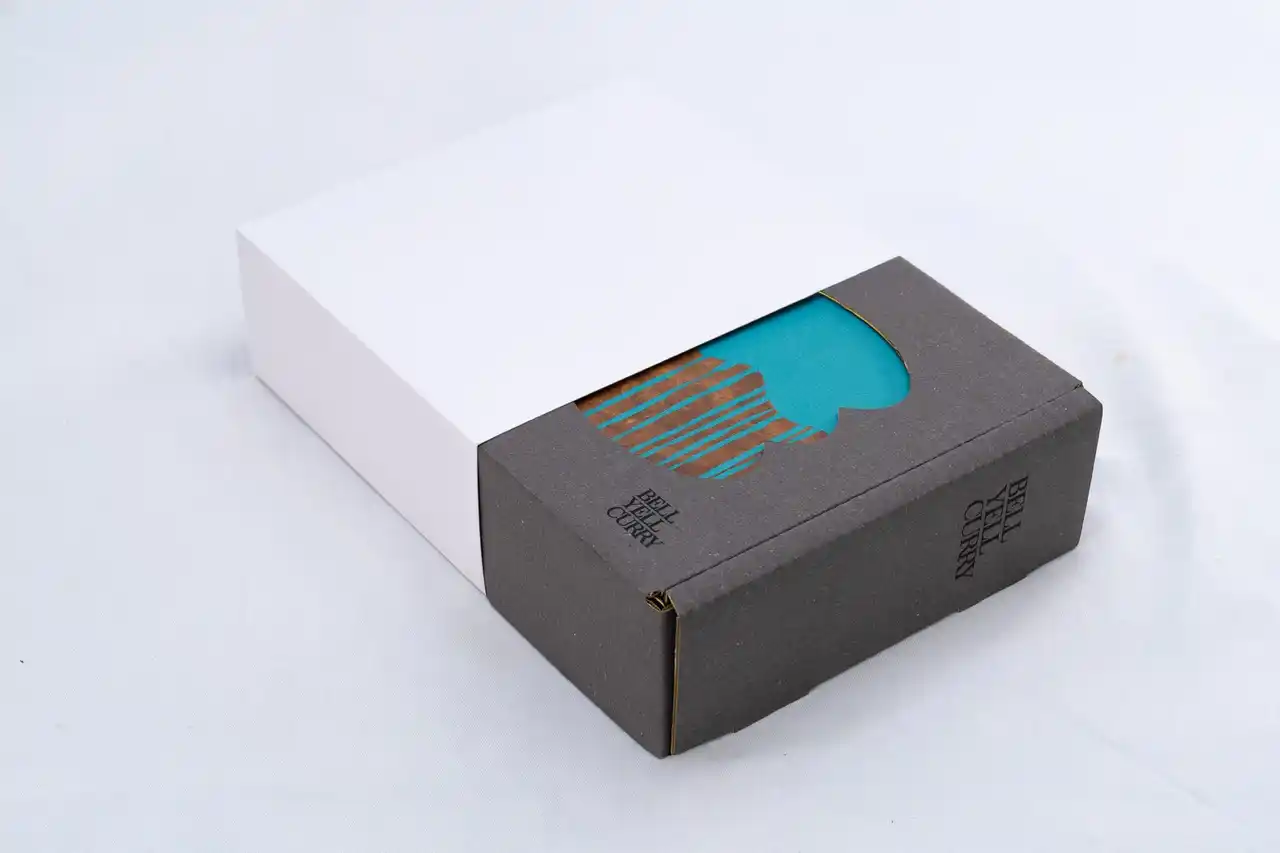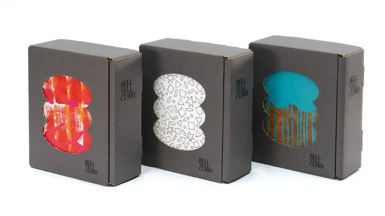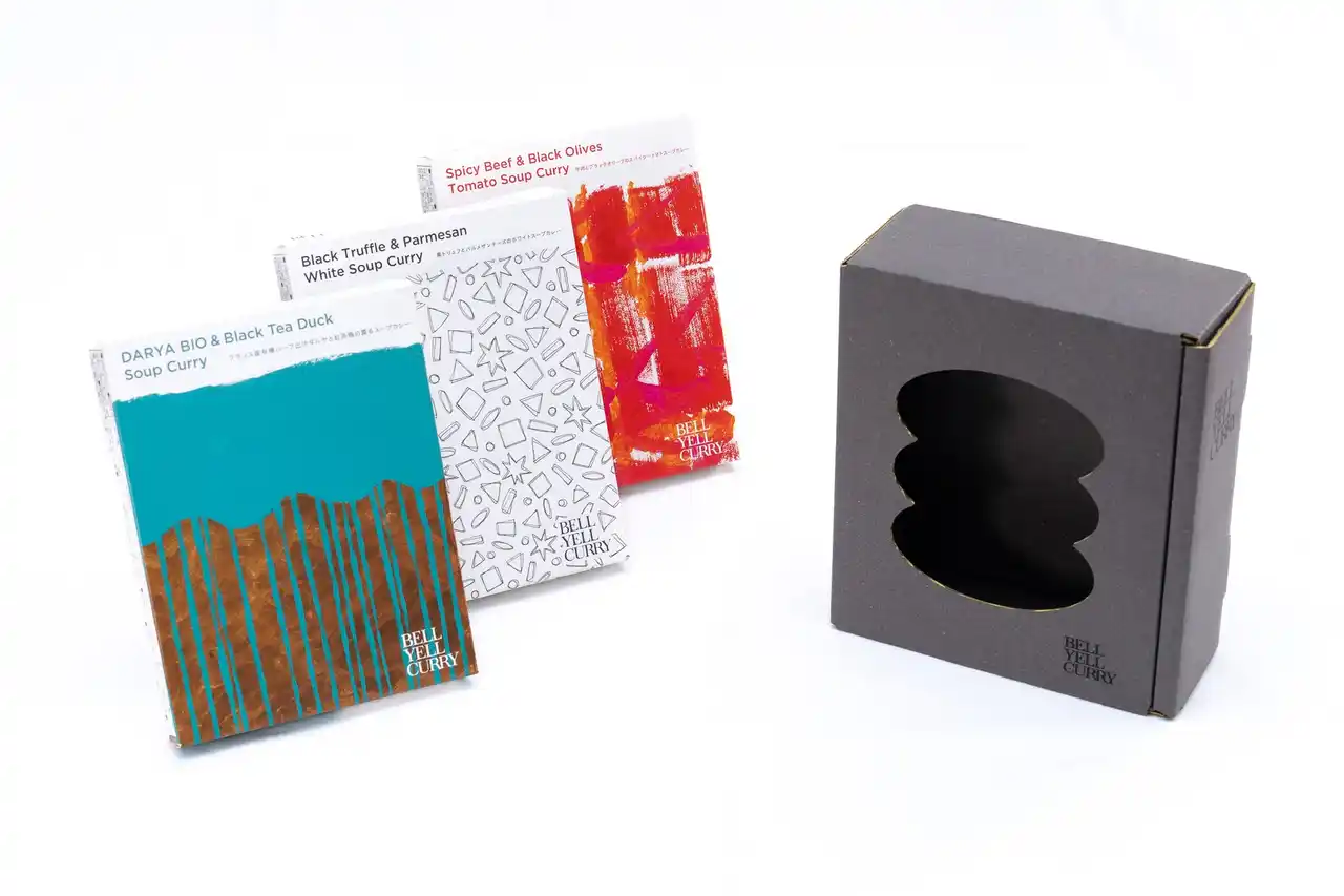 | BELL YELL CURRY スープカレー 全3種が収納できる、専用のクラフト紙製(段ボール型)のギフトボックスです。落ち着いたマットグレーの本体正面は、BELL YELL CURRYのアイコンである「折り重なったカレー皿」の形状にダイカット。また、裁断面は蛍光イエローで彩色。まるで額縁のようにパッケージのアート作品を美しく彩ります。また、ギフトボックス外装には白いスリーブを装着。「With Thanks.」の文言が入ったシルバーのギフト用シールも貼付します。 | ||||||||||||||
