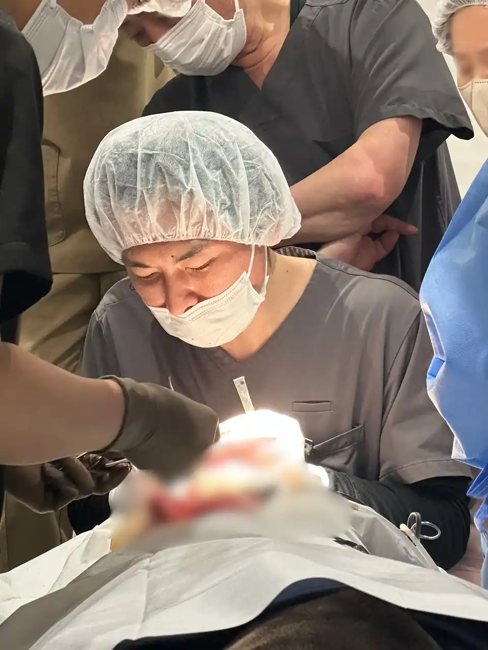 裏ハムラ法とは、加齢などによって目の下に突出してしまった脂肪を除去せずにくぼみへ移動・固定することで、自然な若返りを実現する手術です。まぶたの内側(結膜側)からアプローチするため、体の表面に傷跡が残らない(無瘢痕)点が大きな特徴です。技術的な難易度が高い術式ですが、当日は実際の患者様を対象に手術の全工程が実演され、安全に行うための知識も共有されました。 |