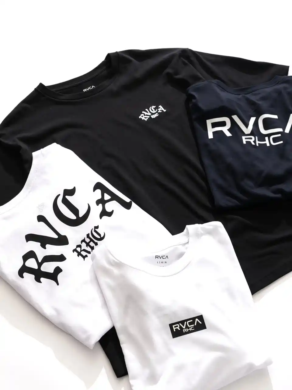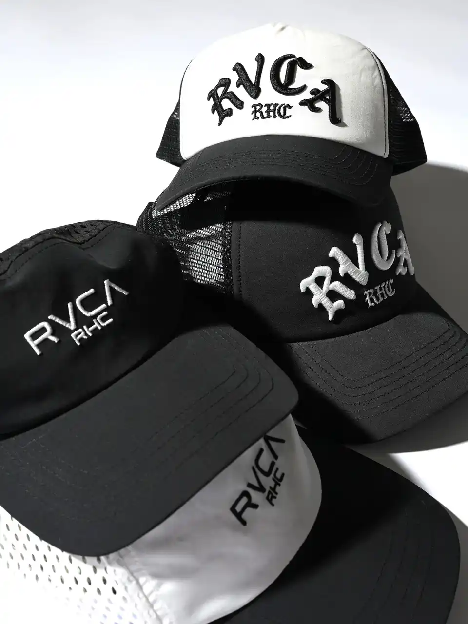 ■ RVCA(ルーカ) 特別なダブルネームを落とし込んだ、都会的な表情のTシャツとメッシュキャップを展開。 |