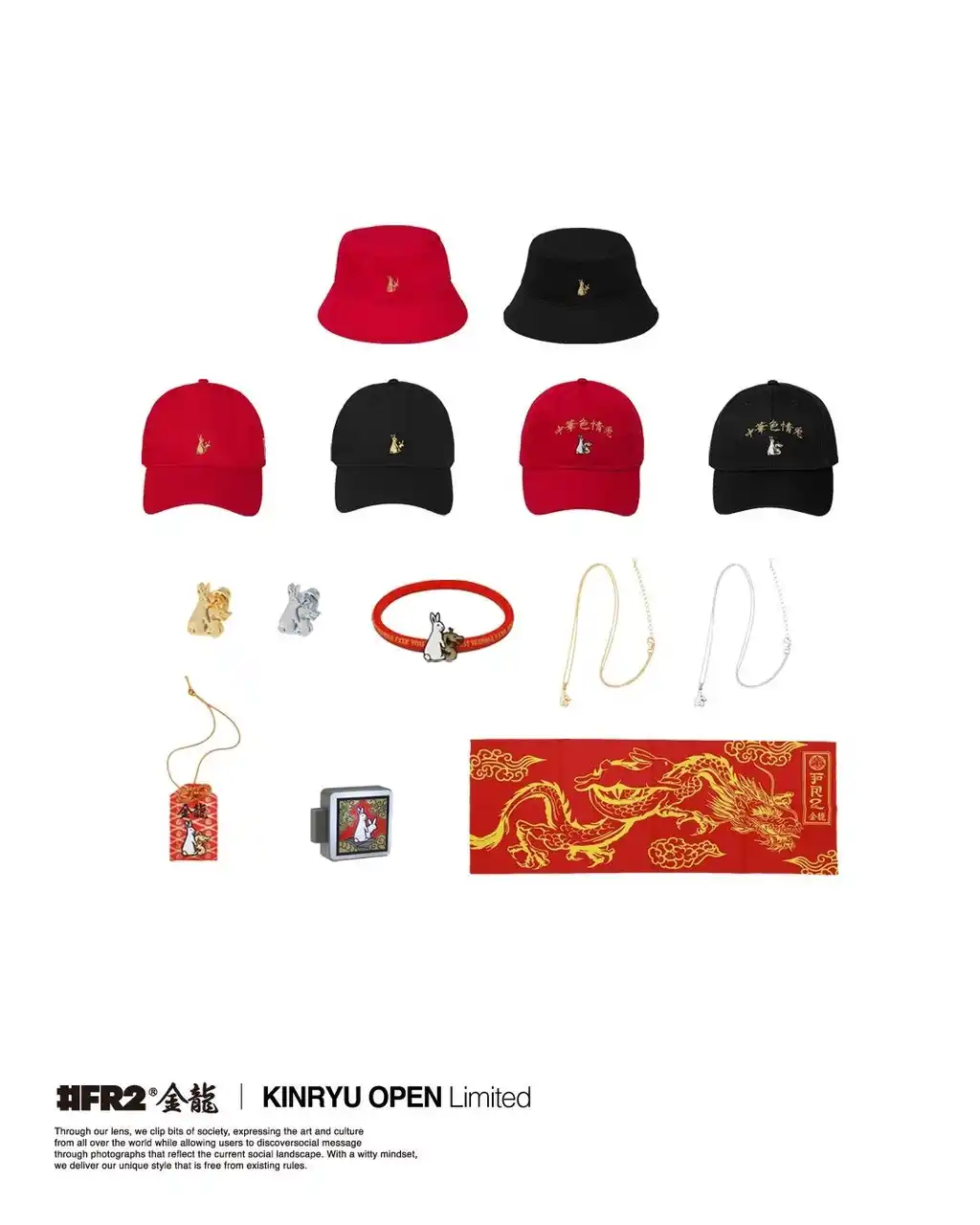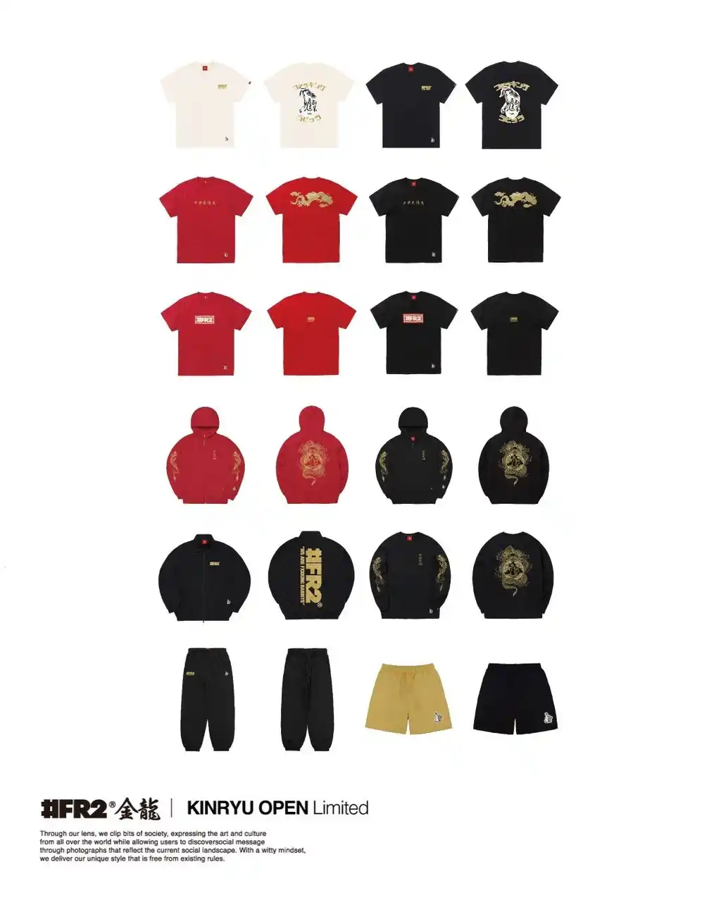 中華街というロケーションから着想を得て、赤や金を基調とした限定カラーを採用。「#FR2金龍」限定のグラフィックを落とし込んだアイテムに加え、#FR2の人気アーカイブデザインを「金龍」カラーでアップデートして限定販売いたします。 |
