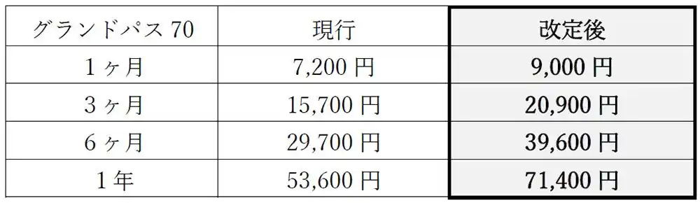 | 近年、燃料価格をはじめとする各種物価の上昇や、人材確保・処遇改善に要する費用の増加など、路線バス事業を取り巻く経営環境は引き続き厳しい状況にあります。こうした中にあっても、公共交通機関として安全・安定した輸送サービスを将来にわたり継続して提供していくため、今後も安定した制度運営を図る観点からグランドパス70の運賃を見直すことといたしました。 | |||||||||||