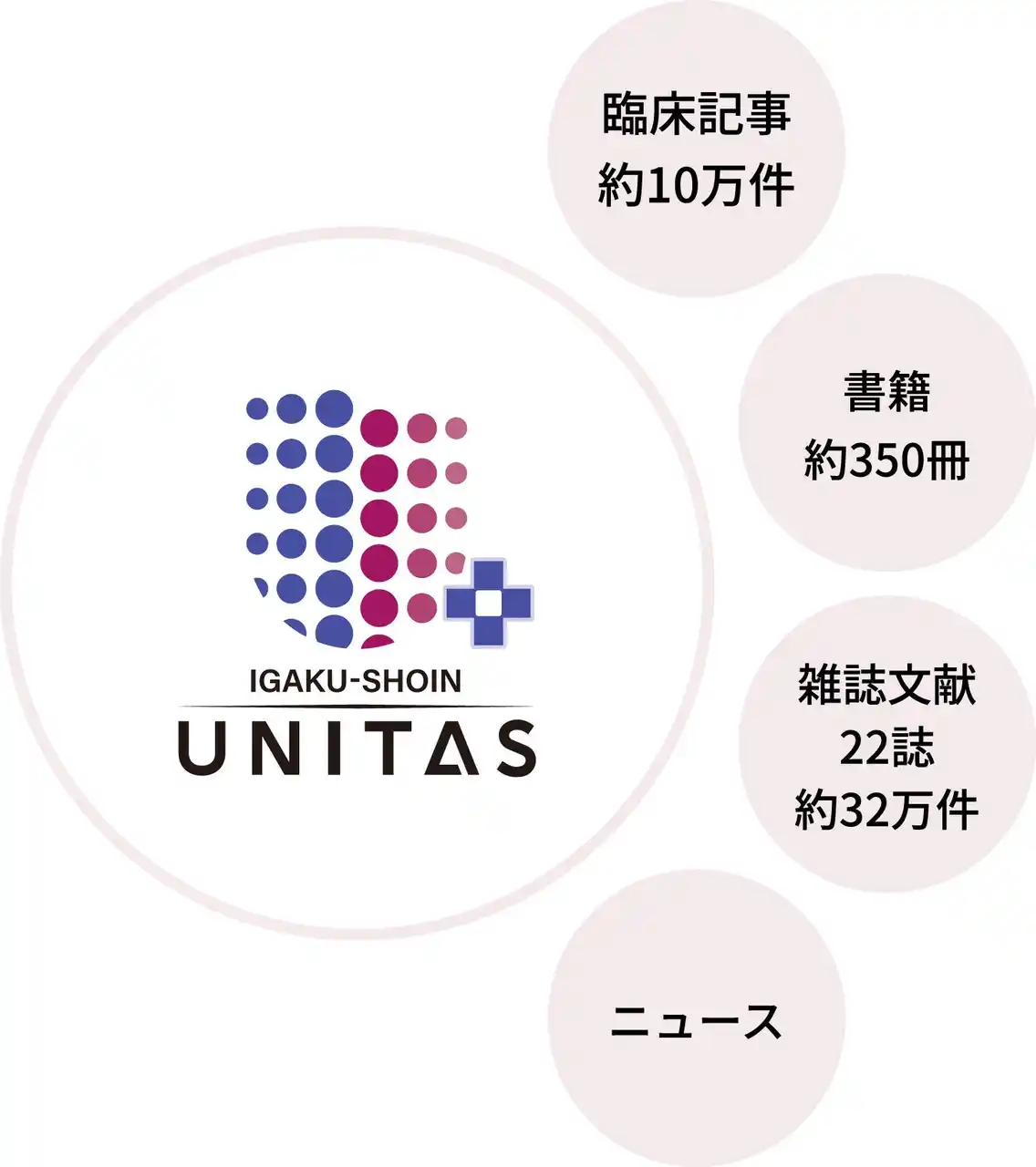 10万項目の臨床記事を集める総合診療データベース『今日の診療』をはじめ、書籍約350冊、医学雑誌22誌(文献数約32万件)、医療ニュースを含む充実のコンテンツラインナップです。 |