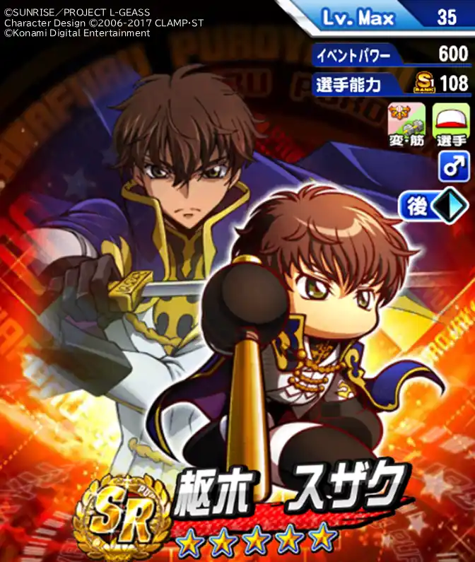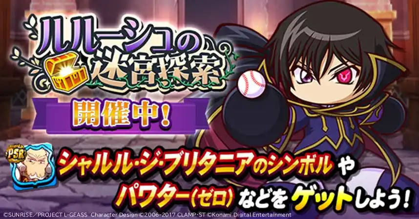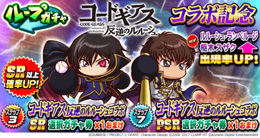 | 株式会社コナミデジタルエンタテインメントは、モバイルゲーム『実況パワフルプロ野球』(以下、『パワプロアプリ』)とアニメ『コードギアス 反逆のルルーシュ』とのコラボレーションを、本日4月23日(木)から開始したことをお知らせします。 | ||||||||||||||