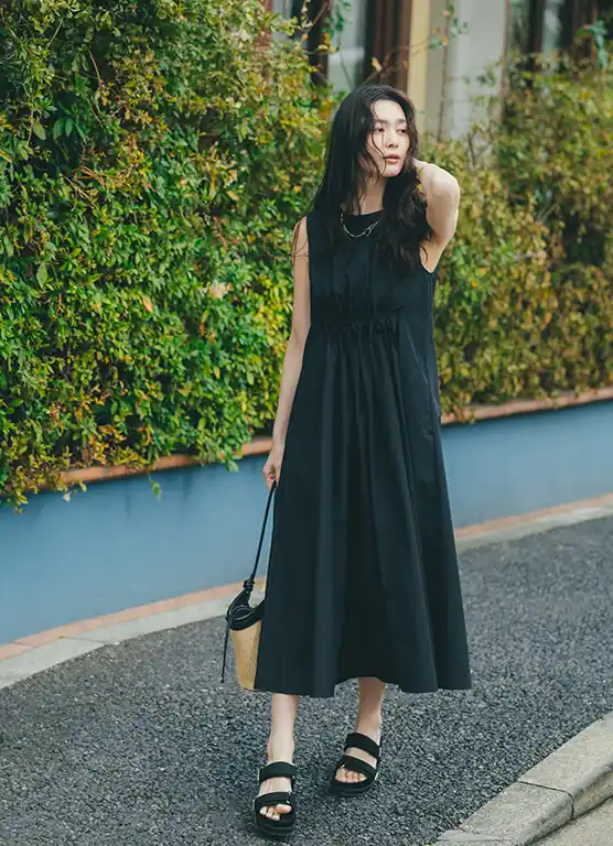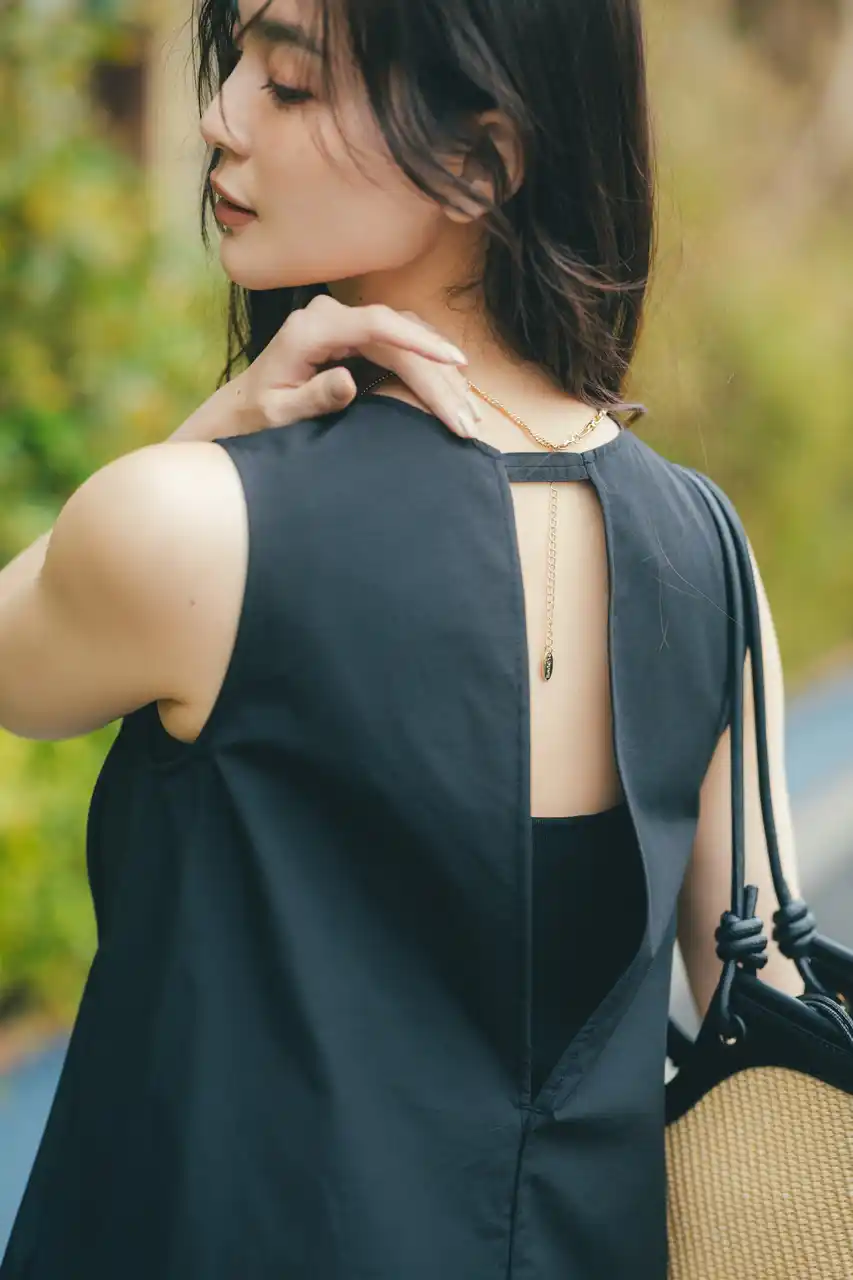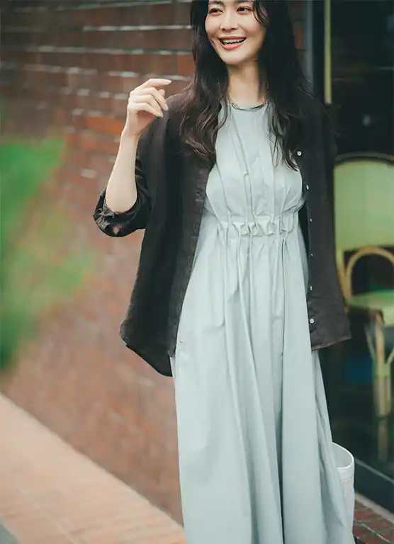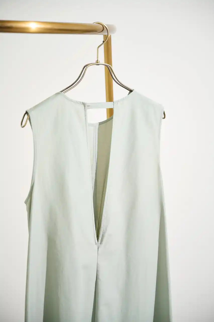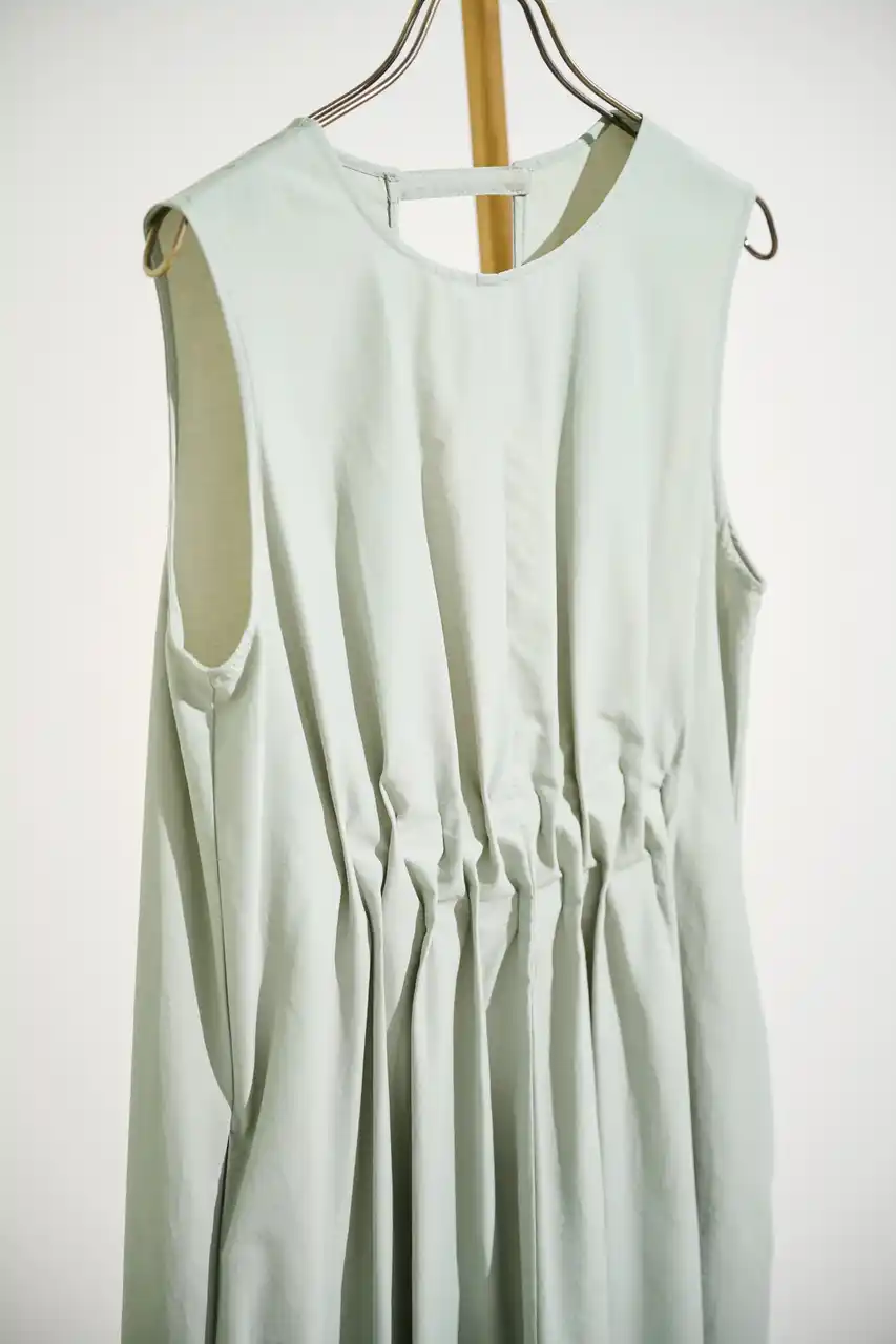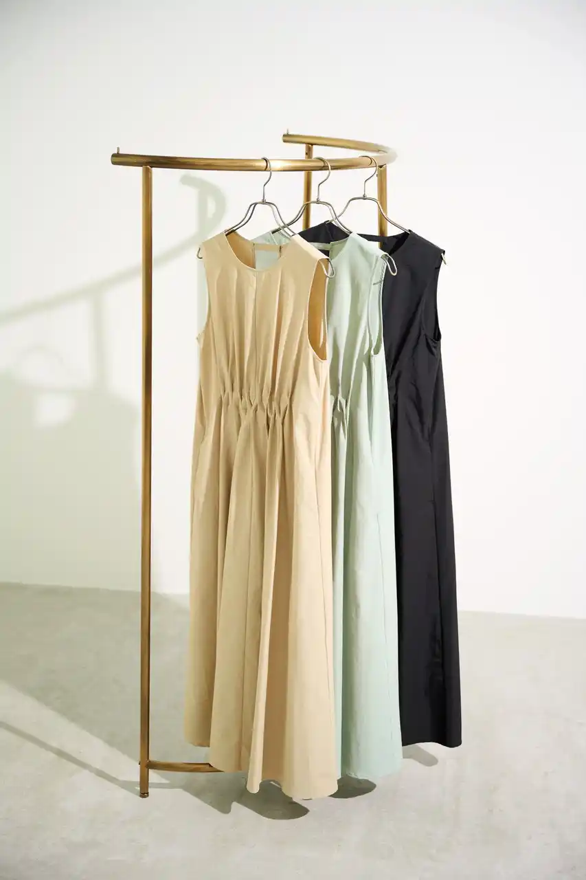ウエスト位置を高めに設定したタックデザインにより、脚長効果とスタイルアップを両立。体からつかず離れずのリラクシーな着心地ながら、Aラインシルエットが細見えを叶えます。一番の魅力は計算し尽された潔いバックシャンデザイン。ヘルシーな肌みせが美しさと抜け感を最大限に引き出します。ドライな肌触りでマシンウォッシャブル・ノンアイロンはもちろん、撥水・UVカットの機能も。 |