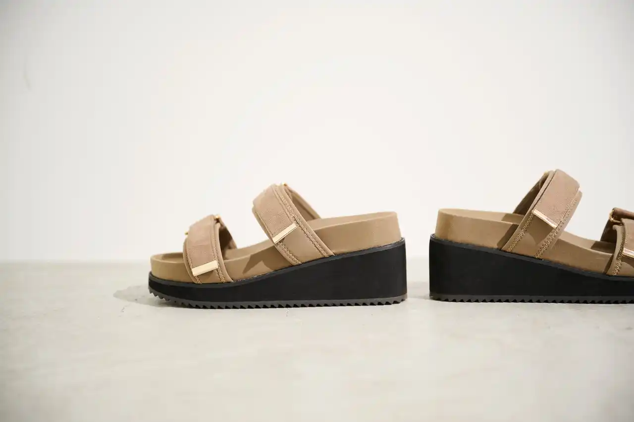 ベースはスポーティでヘルシーなデザイン。そこにさりげなくあしらわれた「メタルパーツ」が洗練されたアクセントをプラスします。ラフになりすぎない一足に仕上げました。足を美しく長く見せる「6cm」の厚底ソール。前側に3cmの厚みを持たせることで傾斜をゆるやかに。足への負担が少なく、安定感も抜群です。 |