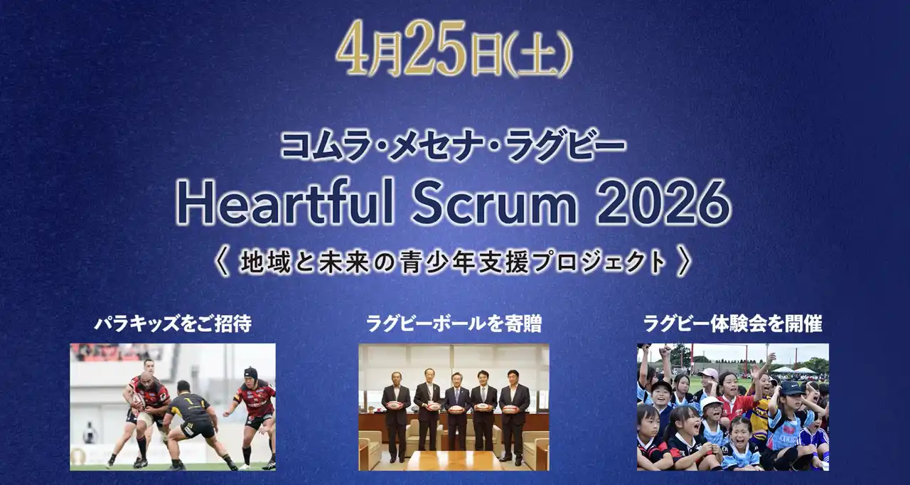 株式会社コムラエージェンシー(本社:東京都港区三田、代表取締役:小村 峰之)は、今週末の2026年4月25日(土)に、創業40周年記念事業として青少年支援プロジェクト「ハートフル・スクラム2026」を開催いたします。 イベントは、4月25日(土)14時30分より秩父宮ラグビー場 (東京)で開催される、NTT JAPAN RUGBY LEAGUE ONE 2025-26 第16節 東芝ブレイブルーパス東京 対 横浜キヤノンイーグルスの試合に合わせ、開催されます。 当日は港区内の幼稚園・保育園・小学校へのラグビーボール贈呈式のほか、パラキッズの試合招待、プロ選手と交流できる子ども向けラグビー体験会を実施します。地域と次世代をつなぐ本イベントに、ぜひご注目ください。 (※メディア関係者様の当日取材も受け付けております) |