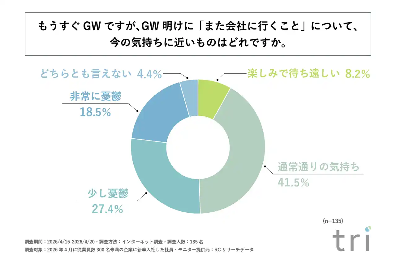 中小企業の新卒社員の45%以上が、GW明けに「また会社に行くこと」に対して、憂鬱な気持ちを抱えている |