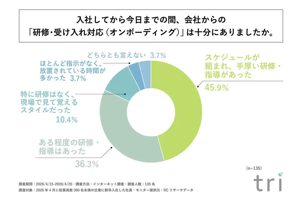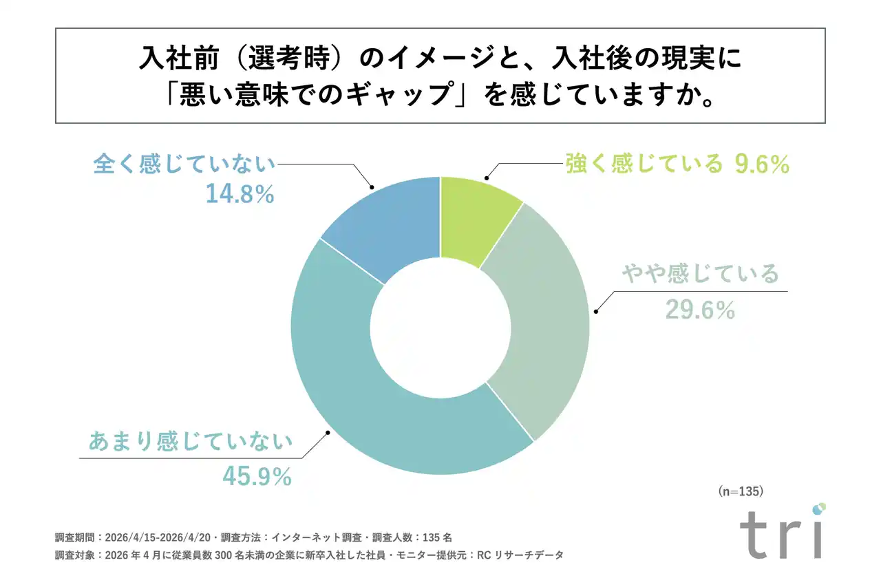 中小企業向けに組織開発コンサルティングサービスを提供する合同会社tri(本社:千葉県印西市 、代表:大久保 圭祐)は、2026年4月に従業員数300名未満の企業に新卒入社した社員(以下、中小企業の新卒社員)を対象に「2026年新卒社員の入社直後の意識調査」を実施しました。この調査から、中小企業の新卒社員の入社前後のギャップの実態や今後の勤続意欲、会社に求めることなどが明らかになりました。