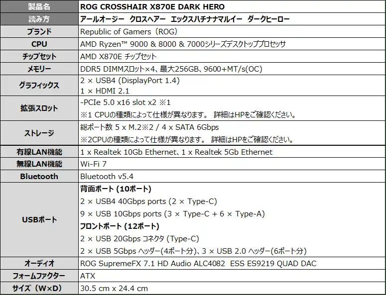 ASUS JAPAN株式会社は、ゲーミングブランドRepublic of Gamersより、AIO Qコネクタを搭載したAMD AM5 ソケットX870Eチップセットのマザーボード「ROG CROSSHAIR X870E DARK HERO」、ホワイト基板のTUF Gamingマザーボード「TUF GAMING X870-PRO WIFI7 W NEO」、B650チップセットのMicroATXマザーボード「TUF GAMING B650EM-E WIFI」の3モデルを発表しました。2026年4月24日(金)より販売開始します。 |