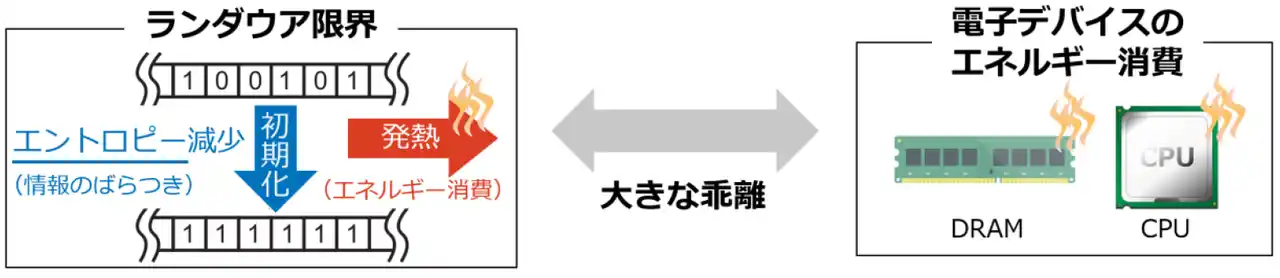 1.背景 情報処理の省エネルギー化は、生成AIの普及に伴う電力消費の増大を背景に喫緊の課題となっており、さまざまな研究開発が行われています。一方で、より原理的な観点から、情報と熱力学の間に深い関係があることが近年明らかになっています。例えば情報処理では、ばらついた情報を一定の状態に揃える「初期化操作」が行われます。この際、情報のばらつきを表すエントロピーが減少し、その代償として発熱、すなわちエネルギー消費が生じます。 このエネルギー消費の理論的最小値はランダウア限界(※3)として知られており、情報処理の省エネルギー化を考える上での重要な指標となっています(図2)。しかし、実際の電子デバイスでは、この限界を大きく上回るエネルギーが消費されており、その乖離の原因解明が、省エネルギーデバイス創出に向けた重要課題となっています。 |