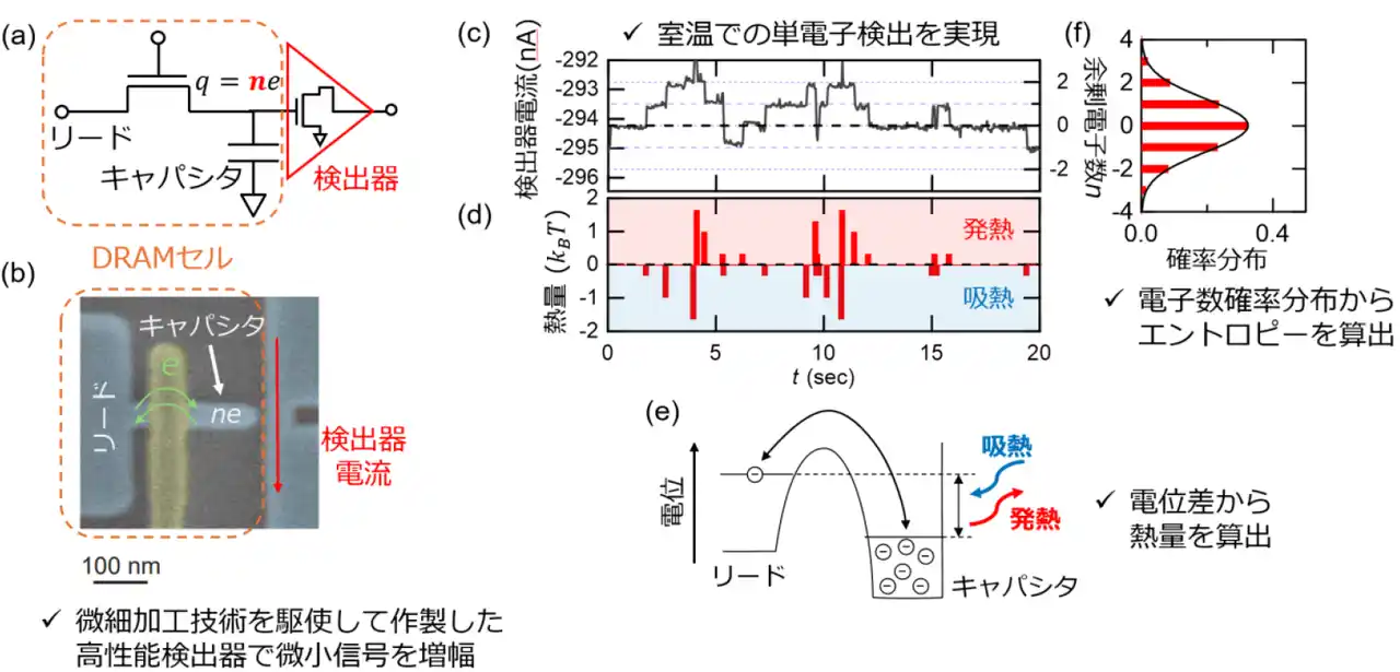 | エントロピーは、情報の確率分布から計算される物理量です。DRAMセルの情報を決めるキャパシタの電荷量を単電子単位で測定することで情報を正確に取得できるため、これによりエントロピーを計算することが可能になりました。(図4(f))。 | ||||||||||