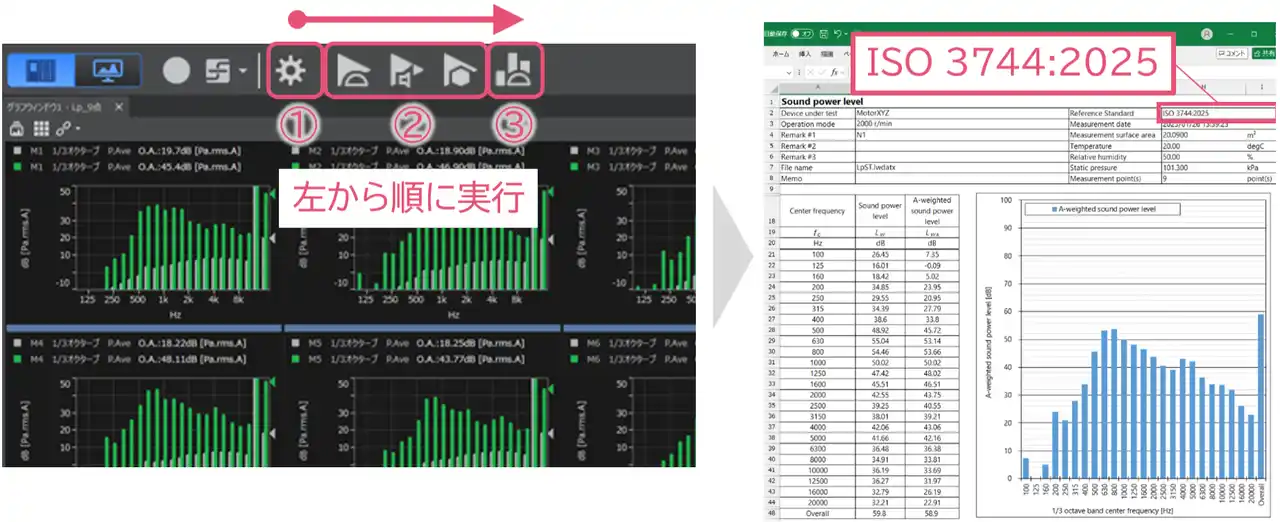 本システムは、2024年2月にリリースしたアプリケーションソフトウェア「OS-0541 音圧法音響パワーレベル」と音響振動解析システム「O-Solution・DS-5000」を組み合わせた計測システムのバージョンアップとなります。新たに15年ぶりに改訂された国際規格 ISO 3744:2025 にいち早く対応しました。また規格範囲を超えた広帯域計測により、建設機械やコンプレッサーの低周波音から、自動車分野で課題となっているモーターやインバーターの高周波音まで、広い周波数レンジの計測に対応します。さらに、音の発生源や周波数ピークを容易に可視化できるため、解析作業の効率化を実現し、エンジニアの工数削減に貢献します。 |