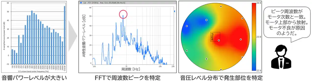 本システムは、1つのソフトウェアで音響パワーレベル計測と原因分析を行うことができます。規格のオクターブ毎の結果よりも詳細な音響パワーレベルを観測することで、音の原因となる周波数ピークやタイミング、音源位置の特定を効率よく実施が可能です。再計測の手間なく原因分析を行うことができ、騒音試験のコスト削減につながります。 |