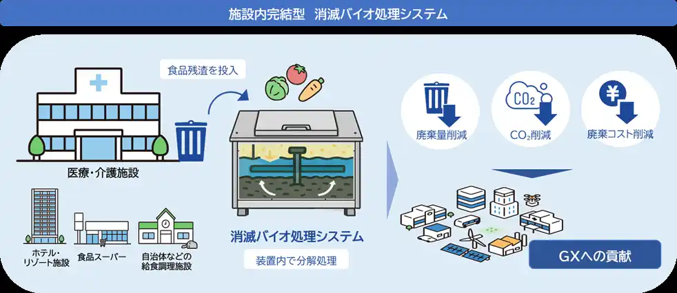 NTTビジネスソリューションズ株式会社(本社:大阪府大阪市、代表取締役社長:木上 秀則、以下、「NTTBS」)と株式会社ウエルクリエイト(本社:福岡県北九州市、代表取締役:松尾 康志、以下、「ウエルクリエイト」)は、病院および介護施設などを主要対象とした「施設内完結型 消滅バイオ処理システム」(以下、「本システム」)の提供を2026年5月1日(金)より開始します。 |