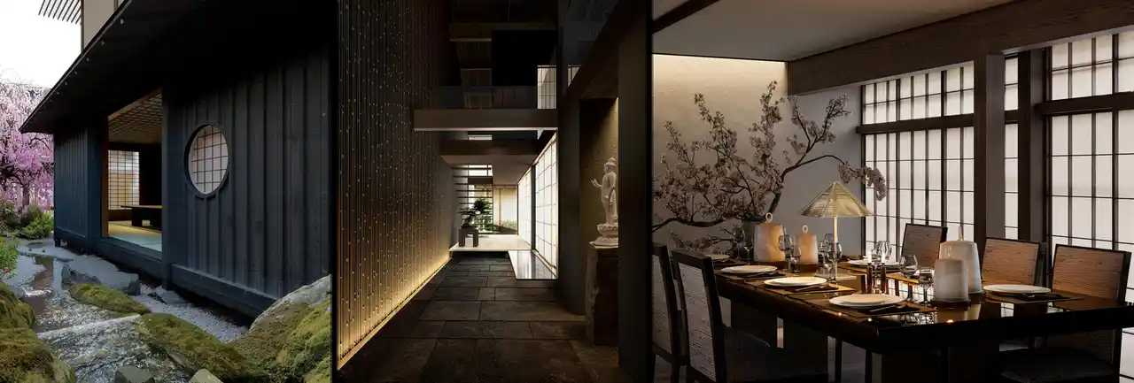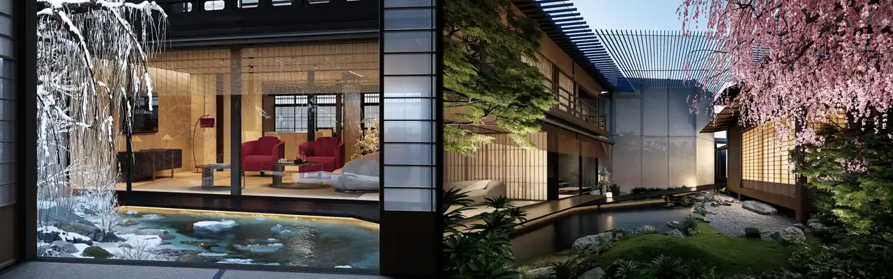 茶室においては、侘び寂びの精神性を純粋に体現する空間として構想されています。施工は、千利休の時代から続く伝統工法を継承した中村外二工務店が手がけ、日本建築の本質的価値を、現代にふさわしいかたちで蘇らせます。また、上七軒の中心にある立地を活かし、舞妓や芸妓を招いてのお茶屋遊びを楽しめる場としても機能。空間を所有することにとどまらず、京都の文化そのものに触れる体験価値を提供します。 |