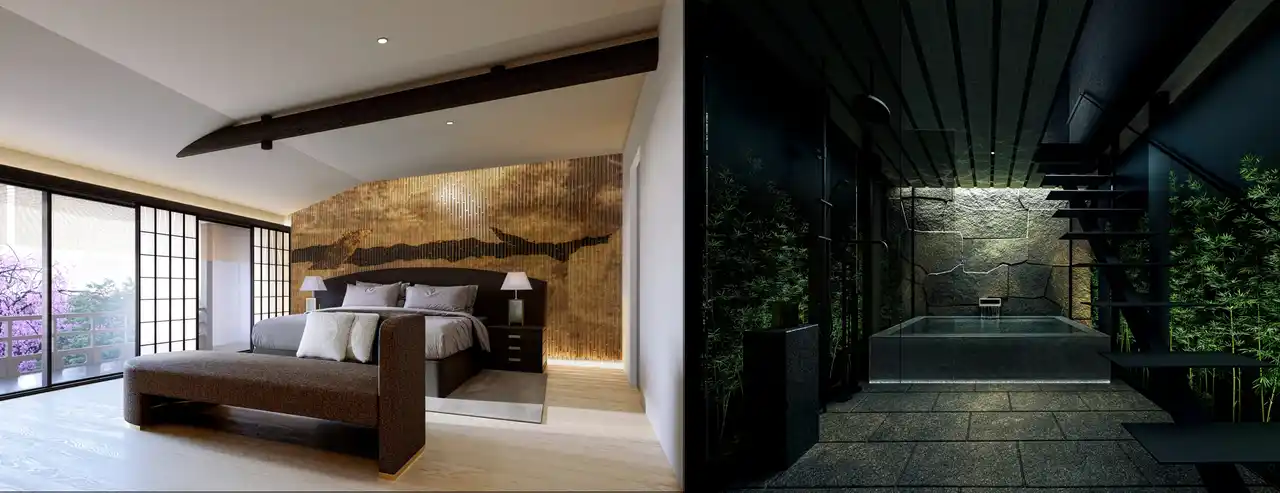 エントランスには、数寄屋造りの趣を受け継いだ吹き抜け空間を設け、京都の景観条例による制約の中でも開放感のある設計を追求。上七軒通りから自然に繋がる石畳のアプローチが内部へと連続し、黒竹を映す漆喰壁が訪れる人を静かに迎え入れます。また、離れに設けられたバスルームは、単なる入浴空間にとどまらず、外に広がる“生きた竹”と呼応することで、景観と建築が一体となる体験を創出。一日の疲れを癒し、自然と対話するような静寂のひとときを提供します。 |