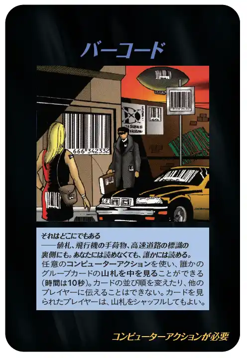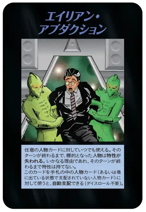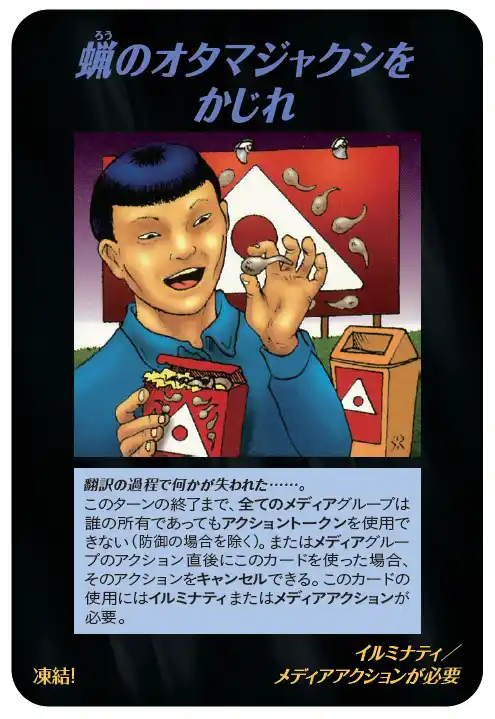 | 『ASSASSINS』は、1995年に米国STEVE JACKSON GAMES社より発売された『ILLUMINATI: New World Order』の拡張セットです。ベースセットに比べ、より過激で暴力的なモチーフが多く、暗殺、病原体、情報操作、環境不安、超常現象、社会混乱など、90年代アメリカ社会に漂っていた不安や皮肉、陰謀論的想像力がより濃密に封じ込められています。 | |||||||||||||||||||