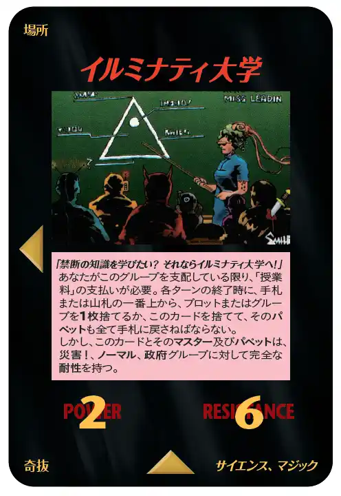 <カード種類の内訳> ○イルミナティカード 2枚(1種2枚) ○グループカード 27枚 ○リソースカード 10枚 ○プロットカード 77枚 ○ニューワールドオーダーカード 11枚 ○ゴールカード 3枚 |