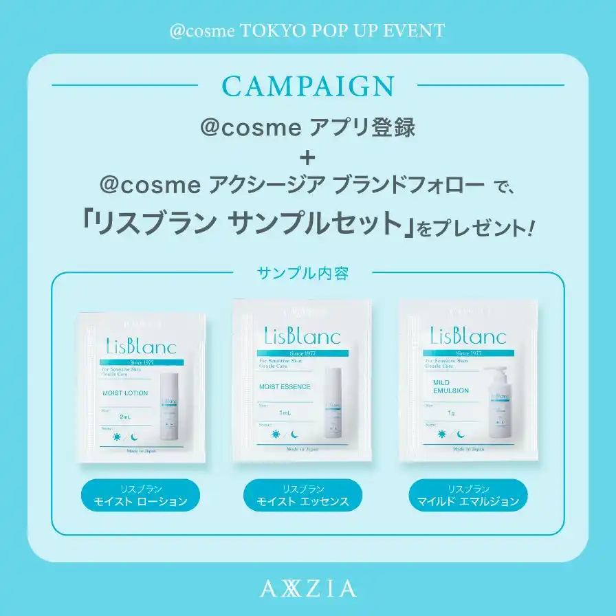 さらに、2026年4月29日(水)~5月5日(火)の期間、 @cosme TOKYO/@cosme OSAKA/@cosme NAGOYAでは「サンプルキャッチ」イベントも開催されます。アクシージアも「リスブラン モイスト エッセンス」サンプルで参加しておりますので、ぜひご参加ください。 |