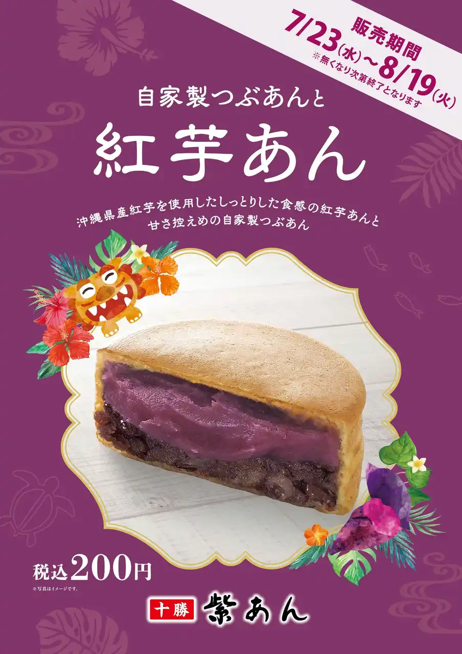 この夏、旅行シーズンにぴったりな期間限定商品として、沖縄県の特産品である“紅芋”を使用した大判焼「自家製つぶあんと紅芋あん」を発売いたします。沖縄の味わいを手軽に楽しみながら、リゾート気分を感じていただける一品となっております。鮮やかな色合いの「紅芋あん」は、紅芋本来の風味としっとりとした食感が特徴で、『紫あん』自慢の甘さ控えめな自家製つぶあんとの相性も抜群、焼き立ての大判焼としてそのままお召し上がりいただけるのはもちろん、冷蔵庫で冷やしていただくと紅芋の自然な甘みが一層引き立ち、暑い季節にもぴったりの爽やかな甘味が楽しめます。 |