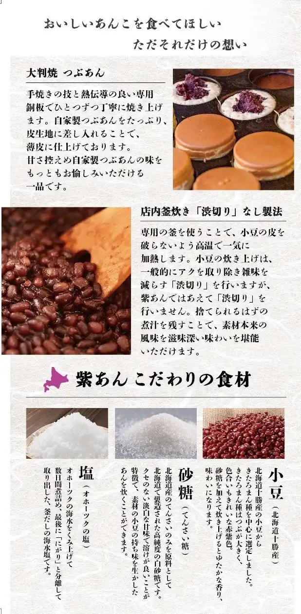 『紫あん』では、素材を厳選し、甘さを抑えつつ小豆の風味を引き立たせるため、「渋切り」をしない独自のつぶあんを店内で丁寧に炊き上げています。北海道の恵みが感じられる自家製つぶあんは保存料無添加で、やさしい味わいが特徴です。 |