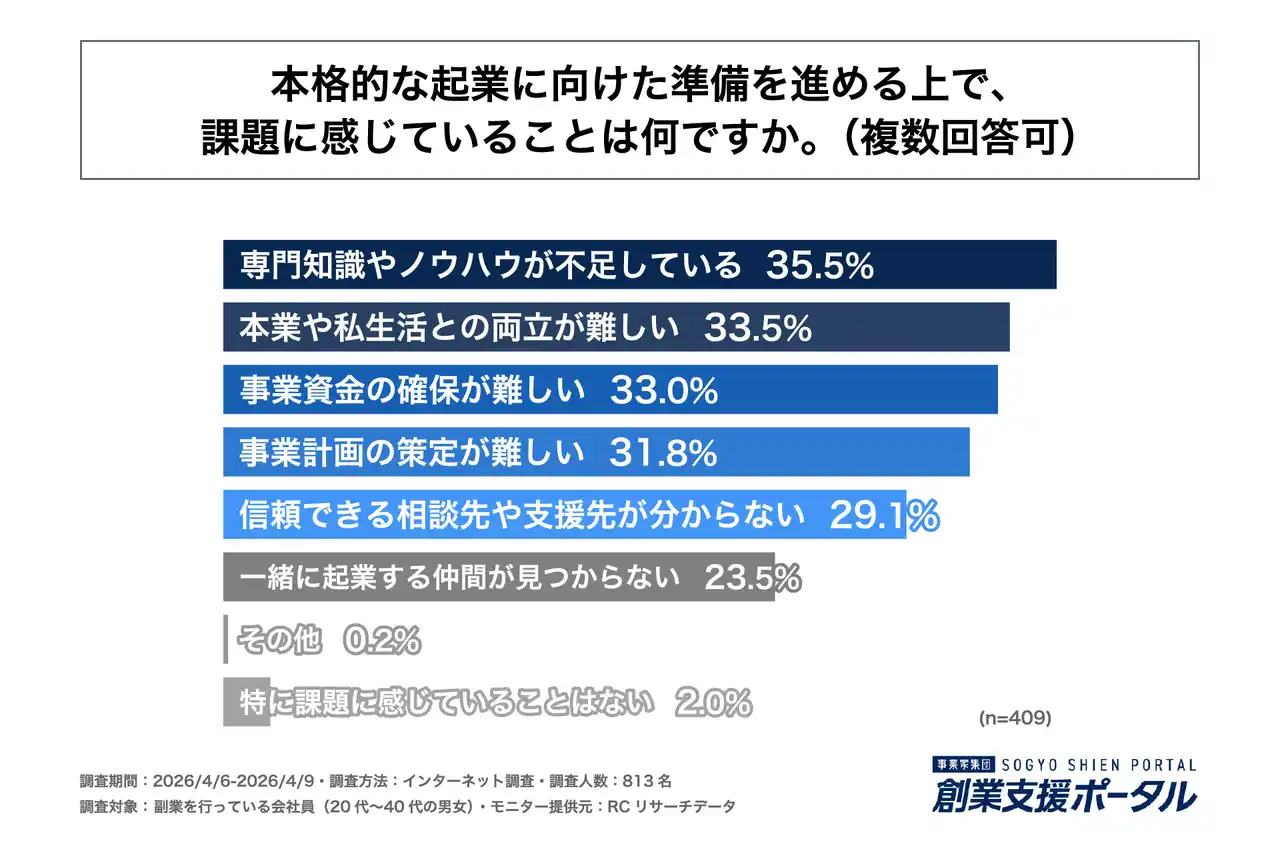 次に、副業の経験を基に将来的に起業する意向があり、具体的に準備を進めている会社員を対象に「本格的な起業に向けた準備を進める上で、課題に感じていることは何か」を尋ねる設問への回答では、1位が「専門知識やノウハウが不足している」で35.5%、2位が「本業や私生活との両立が難しい」で33.5%、3位が「事業資金の確保が難しい」で33.0%という結果になりました。この結果から、本格的な起業に向けた準備を進める上で、課題に感じていることの最多は「専門知識やノウハウが不足していること」であることが判明しました。 |