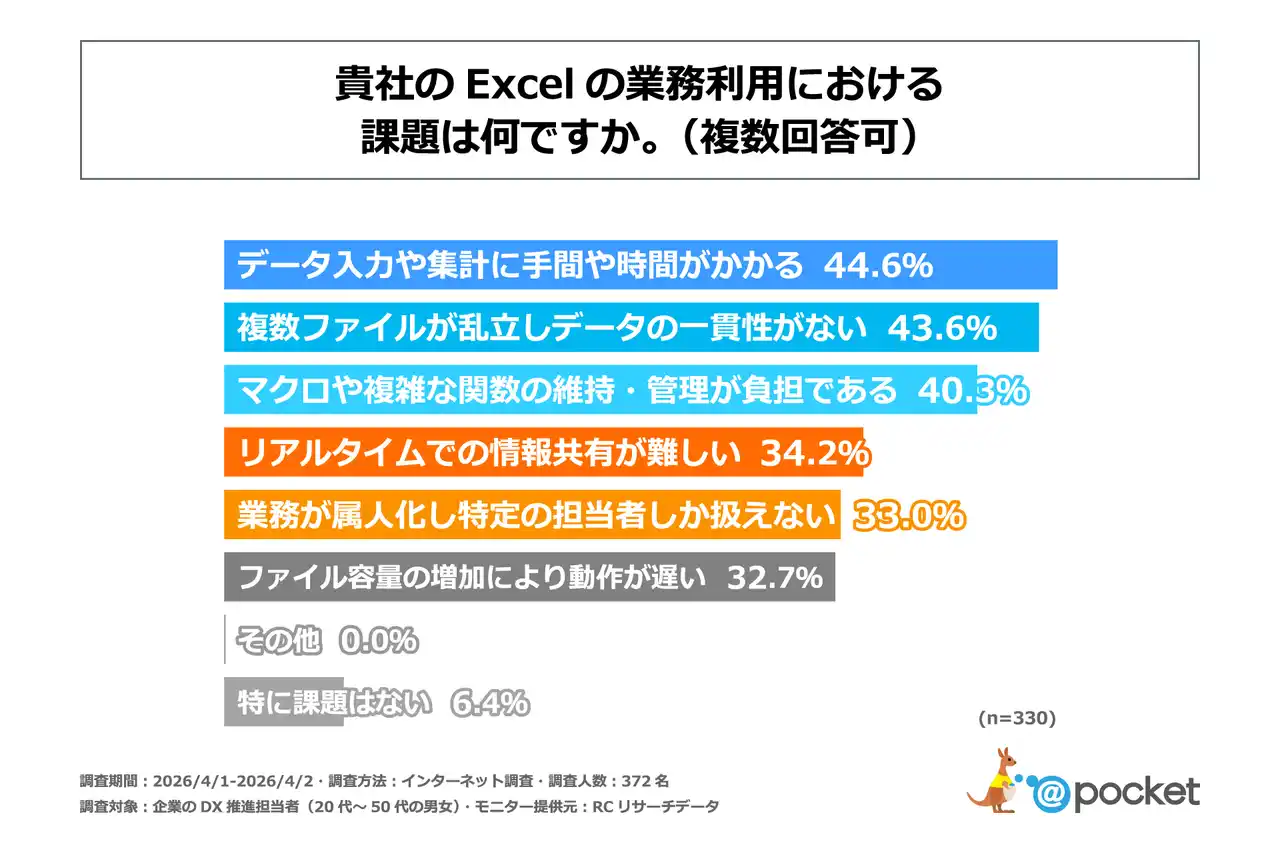 ノーコード業務アプリ作成ツール「@pocket(アットポケット)」を提供する株式会社アイアットOEC(本社:岡山市北区、代表取締役社長:楠田 教夫)は、企業のDX推進担当者(20代~50代の男女)を対象に「企業のExcel依存がDXに与える影響に関する調査」を実施しました。この調査から、企業のDX推進担当者の自社におけるExcelの利用実態や業務上の課題、Excel依存から脱却できない理由などが明らかになりました。 |