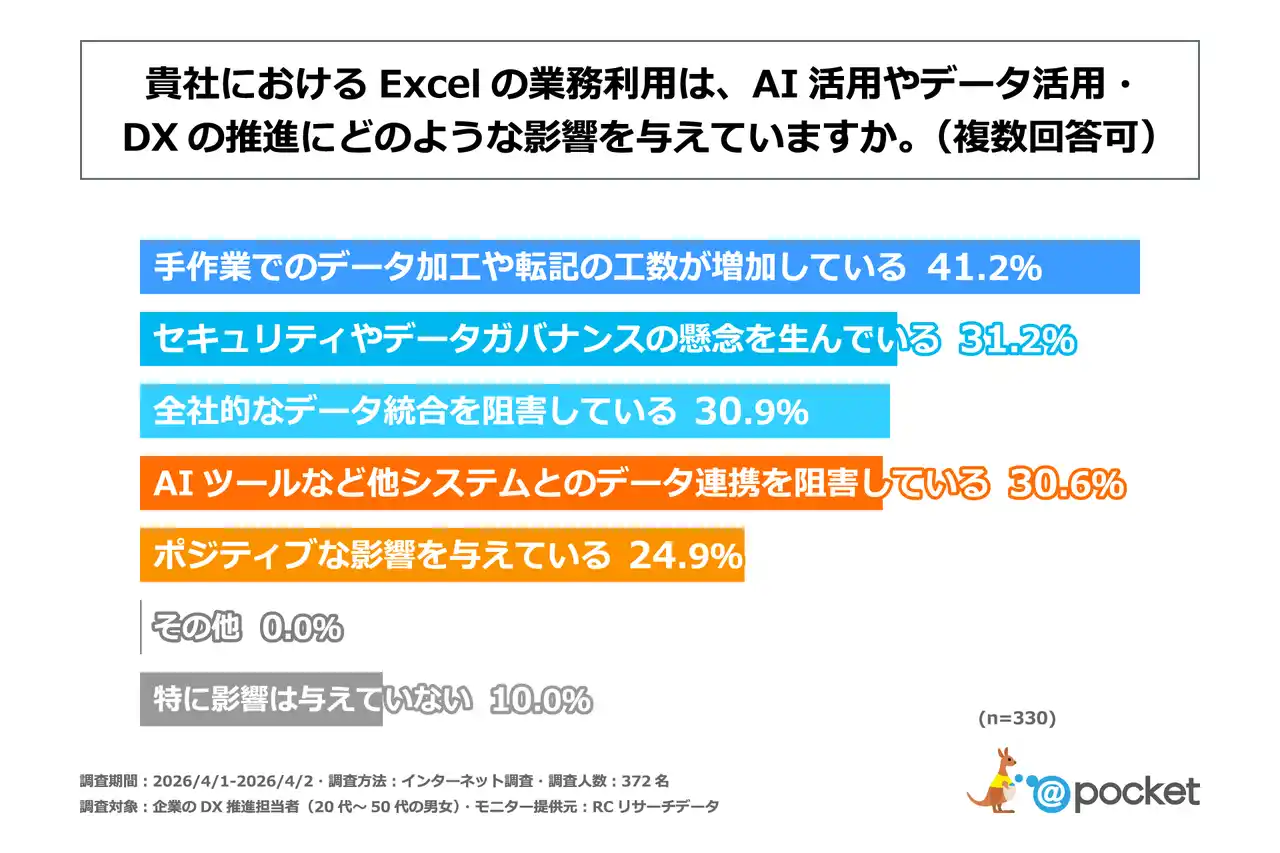 Excelの業務利用がAI活用やデータ活用・DXの推進に与える主な影響は、「手作業でのデータ加工や転記の工数の増加」や「セキュリティやデータガバナンスの懸念の発生」 |