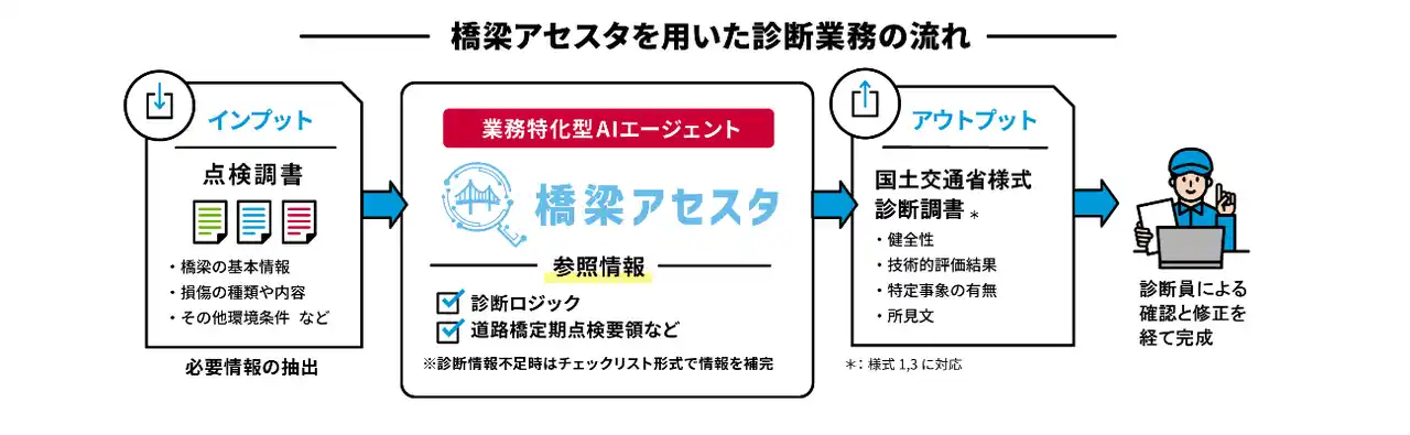 NTTドコモソリューションズ株式会社(旧 NTTコムウェア株式会社 以下、NTTドコモソリューションズ)、株式会社NTTドコモ(以下、NTTドコモ)、株式会社溝田設計事務所(以下、溝田設計事務所)の3社は、国立大学法人長崎大学の監修のもと、橋梁診断支援サービス「橋梁アセスタTM」(以下、本サービス)を共同で開発しました。本サービスは、橋梁の点検票をインプットすると、国土交通省が定める制度・要領等に準拠した様式で診断調書案を自動生成する新たな業務特化型AIエージェントです。本日からNTTドコモビジネス株式会社(旧 NTTコミュニケーションズ株式会社 以下、NTTドコモビジネス)が販売を開始します。 |