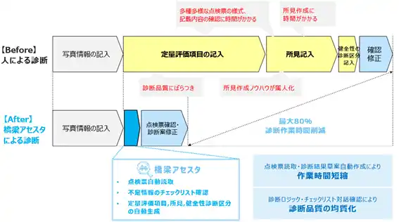 2025年12月から2026年3月に複数の自治体や建設コンサルタントと実施した実運用検証において、本サービスを活用することで、診断業務にかかる作業時間を最大80%削減できることを確認しました。また、経験の浅い技術者でもAIの提示する診断調書案と根拠を確認しながら業務を遂行できる点も評価されています。 |