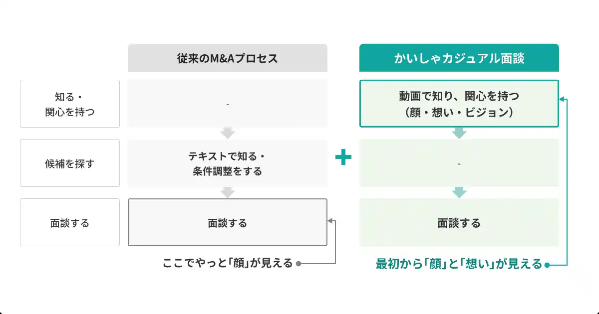 『かいしゃカジュアル面談』は、譲受企業が動画で経営への想いやビジョンを発信し、経営者がM&Aの相手を事前に知ってから検討を始められる仕組みです。譲受企業の「顔」と「想い」が見えることで安心感と納得感を生み、よりオープンでフェアなM&A市場の実現を目指します。 |